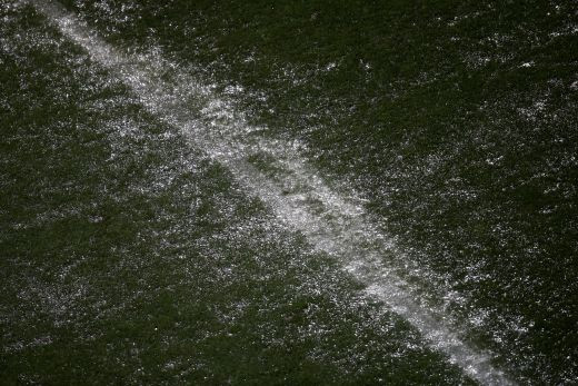 Dupa aproape o ora de pauza, meciul s-a reluat. Gazonul arata bine in ciuda ploii torentiale. Organizatorii au reusit sa scoata toata apa