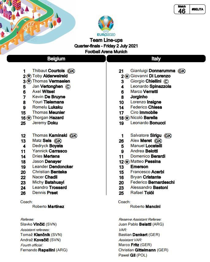 Daca pentru belgieni Eden Hazard si Kevin De Bruyne sunt incerti din cauza unor accidentari, de cealalta parte italieni au sanse reale sa se bazeze pe capitanul Giorgio Chellini.