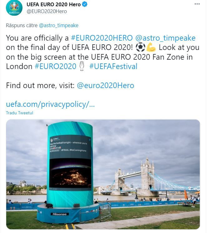 Imaginile i-au impresionat si pe cei de la UEFA, care l-au inclus pe astronaut in lista "eroilor Euro 2020".