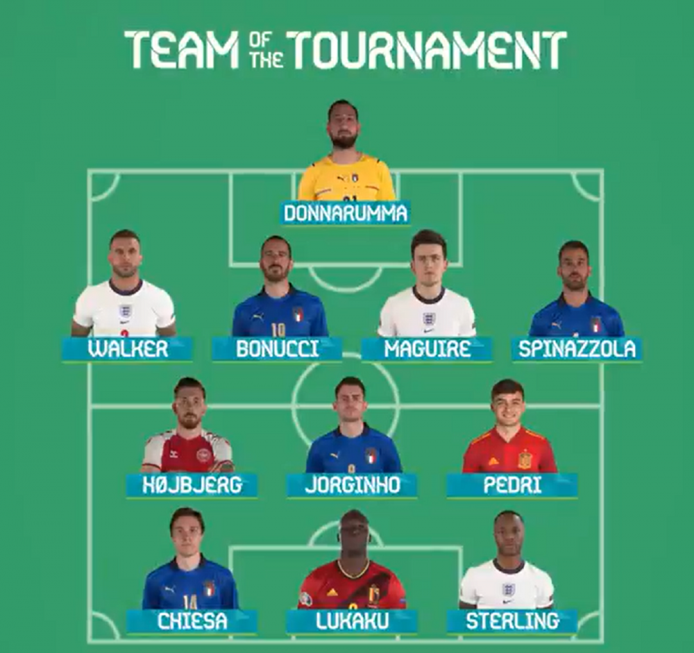 Gianluigi Donnarumma (Italia) - Kyle Walker (Anglia), Leonardo Bonucci (Italia), Harry Maguire (Anglia), Leonardo Spinazzola (Italia) - Jorghinho (Italia), Pierre-Emile Hojbjerg (Danemarca), Pedri (Spania) - Federico Chiesa (Italia), Romelu Lukaku (Belgia), Raheem Sterling (Anglia)