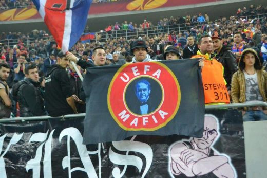 UEFA MAFIA alaturi de imaginea lui Platini scrie pe bannerul afisat de stelisti. Sefului de la UEFA nu-i va placea sa vada asta pe stadionul unde s-a inregistrat record de audienta in optimile Europa League!
