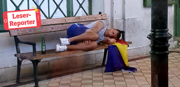 Heute a publicat o imagine cu un suporter stelist doarmind pe o banca din oras, avand langa el tricolorul si o sticla de bere.