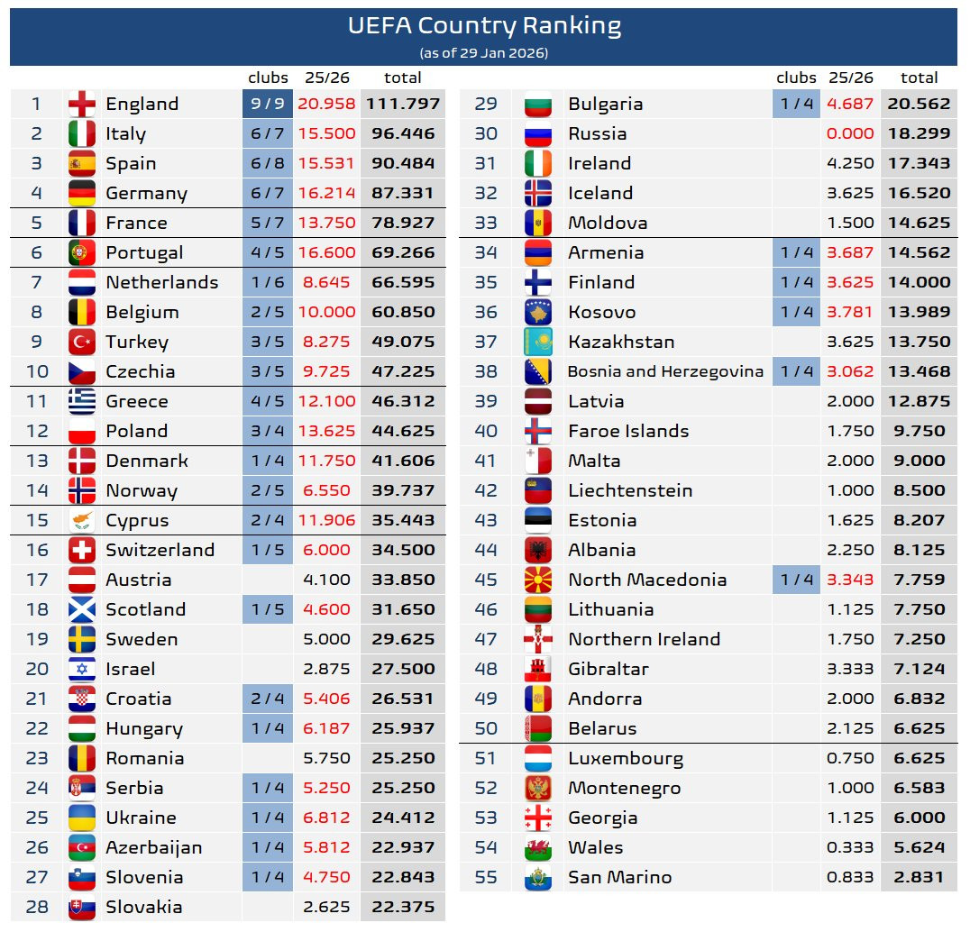În ierarhia în timp real a coeficienților UEFA, bazată pe ultimele cinci sezoane, România se află în continuare pe locul 23, după ce FCSB a adăugat încă 0.250 puncte după remiza cu Fenerbahce (1-1). Țara noastră a pierdut însă lupta cu Ungaria pentru locul 22, Ferencvaros rămânând în competiție și calificându-se de pe locul 12 în play-off-ul pentru optimile Europa League.