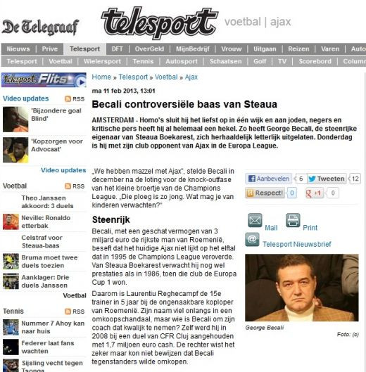 Dupa o dezbatere publica in care lui Becali i-au fost analizate afirmatiile controversate legate de minoritatile sexuale, religioase si etnice, mai multe organizatii i-au cerut lui Ajax ca patronul Stelei sa nu aiba acces la masa oficiala dinaintea meciului. Chiar daca un purtator de cuvant al clubului a declarat ca Becali nu poate fi interzis la pranzul de joi, De Telegraaf anunta ca patronul Stelei nu e pe lista de invitati!