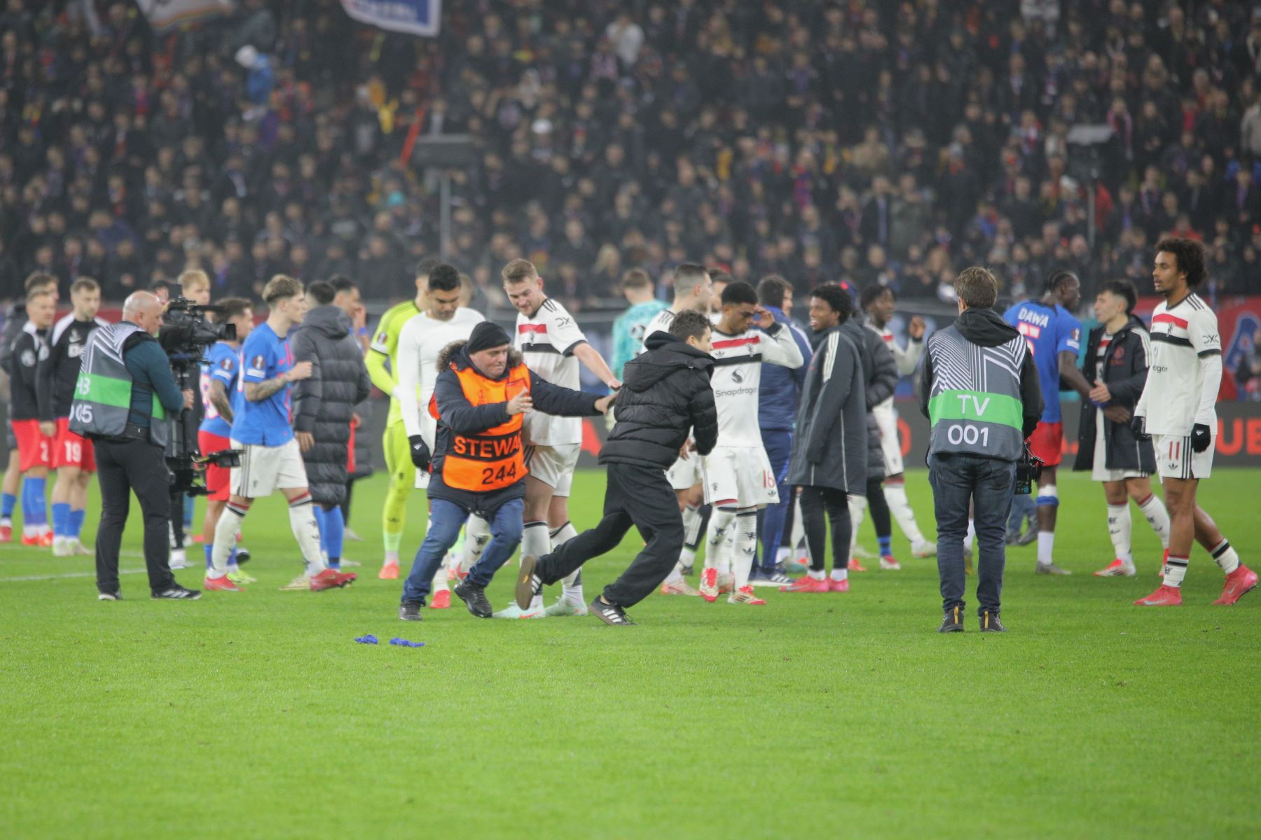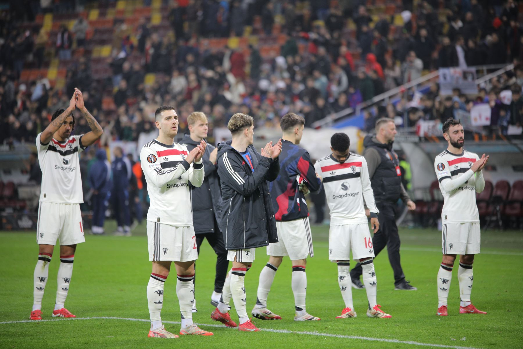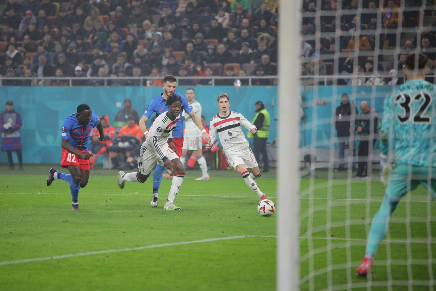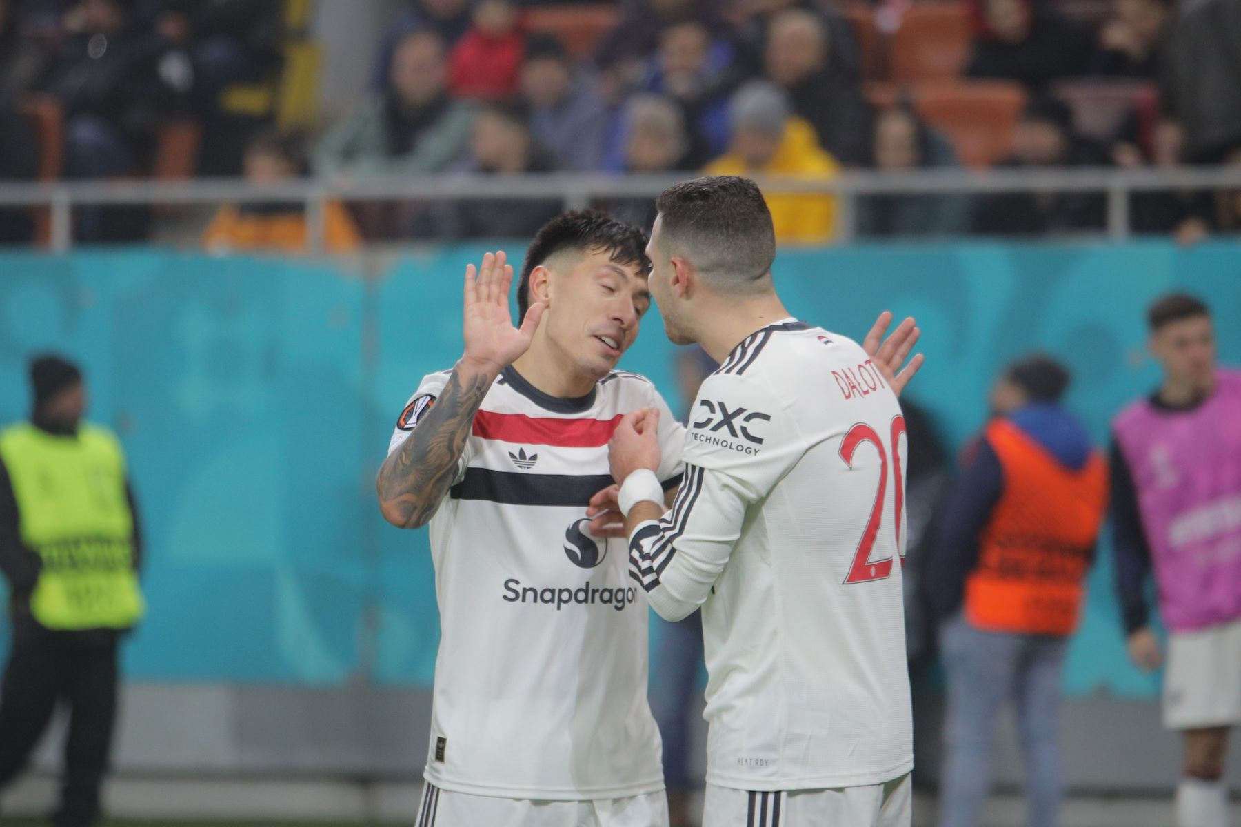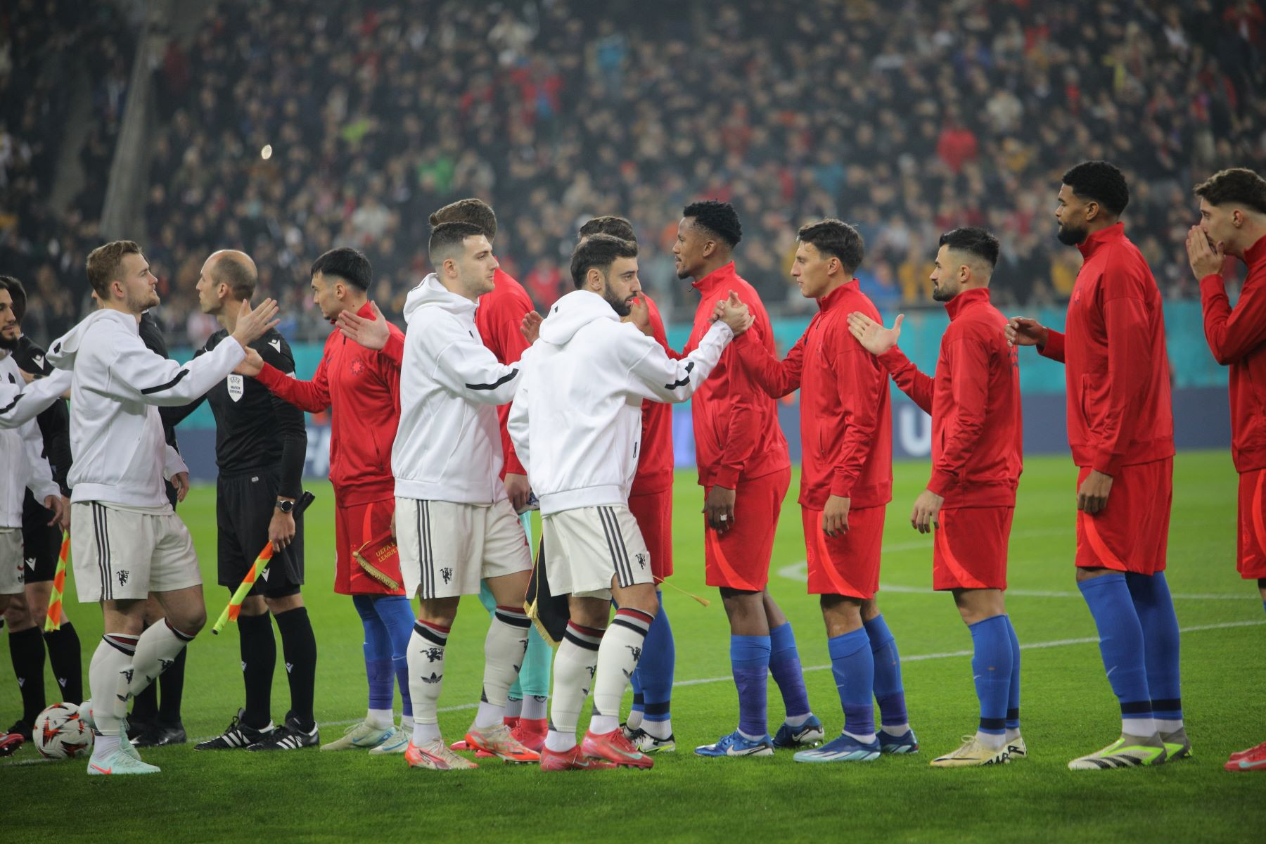 Meciul a fost punctat și de incidente hilare, în care trei tineri fani români ai lui United au intrat pe gazon. Primul a apucat să-și facă poză cu Alejandro Garnacho, al doilea a dat mâna cu Matthijs de Ligt, iar al treilea a alunecat pe iarba umedă și a fost transportat de stewarzi în afara arenei.