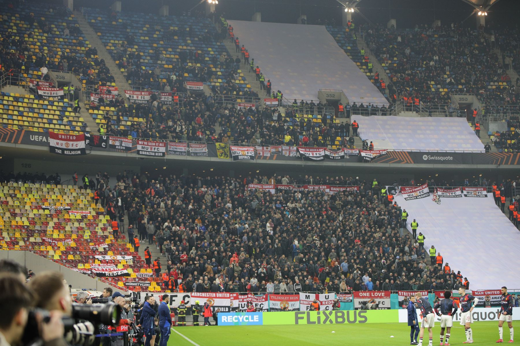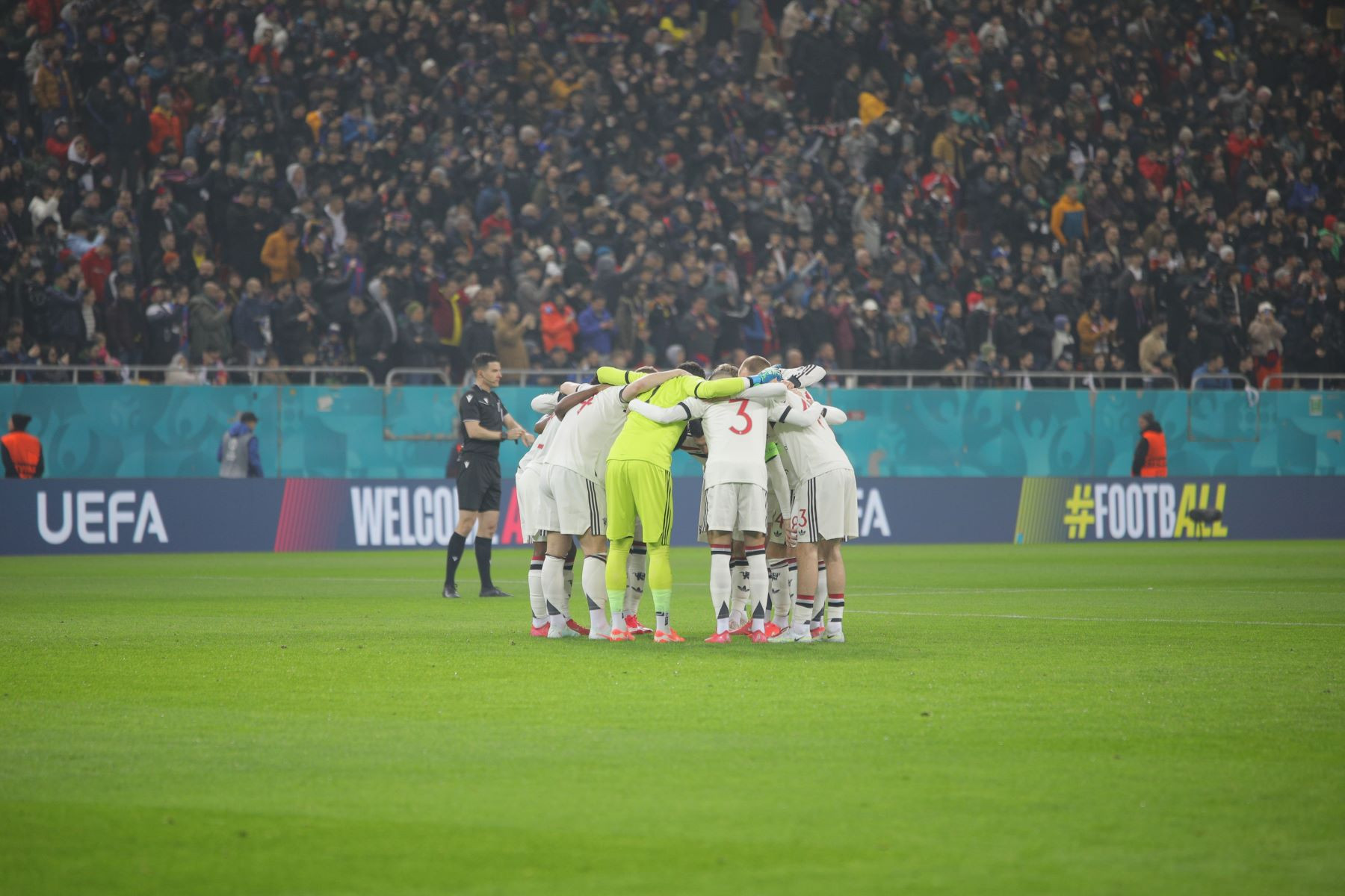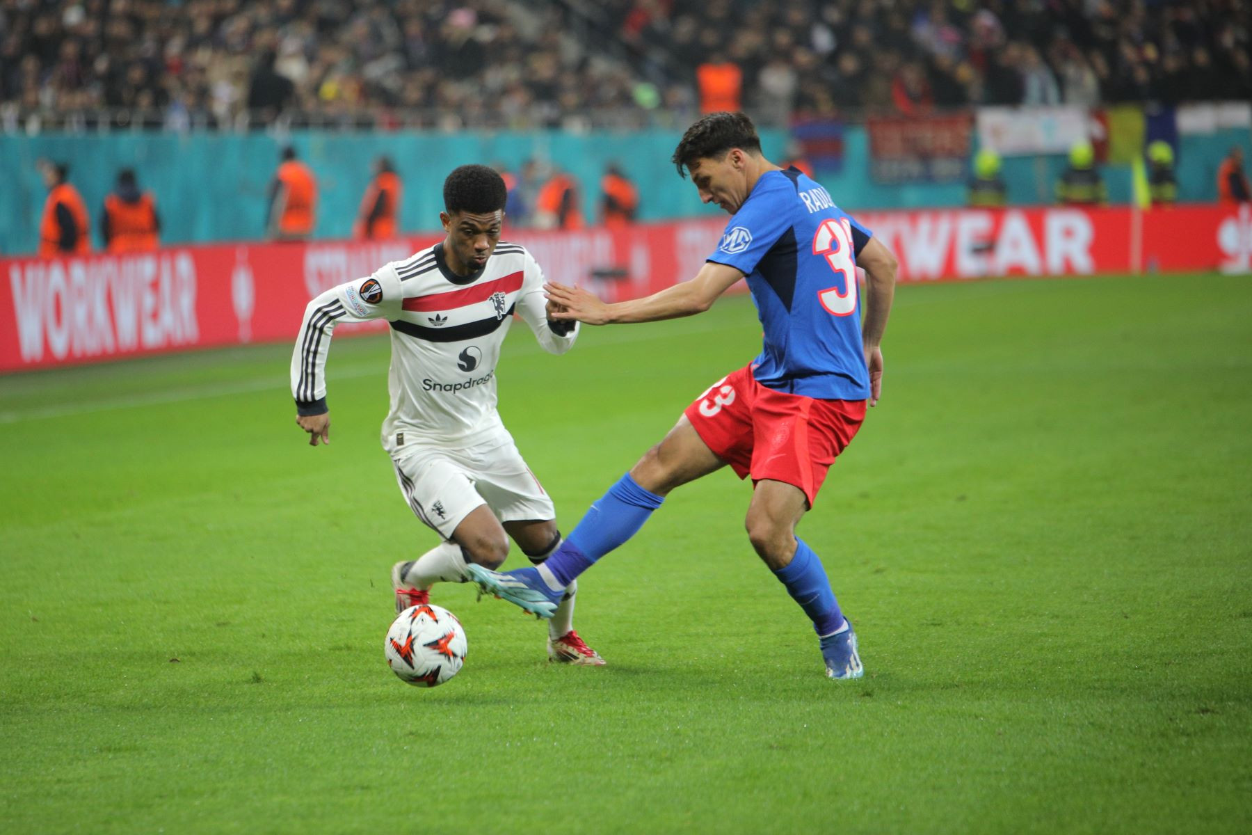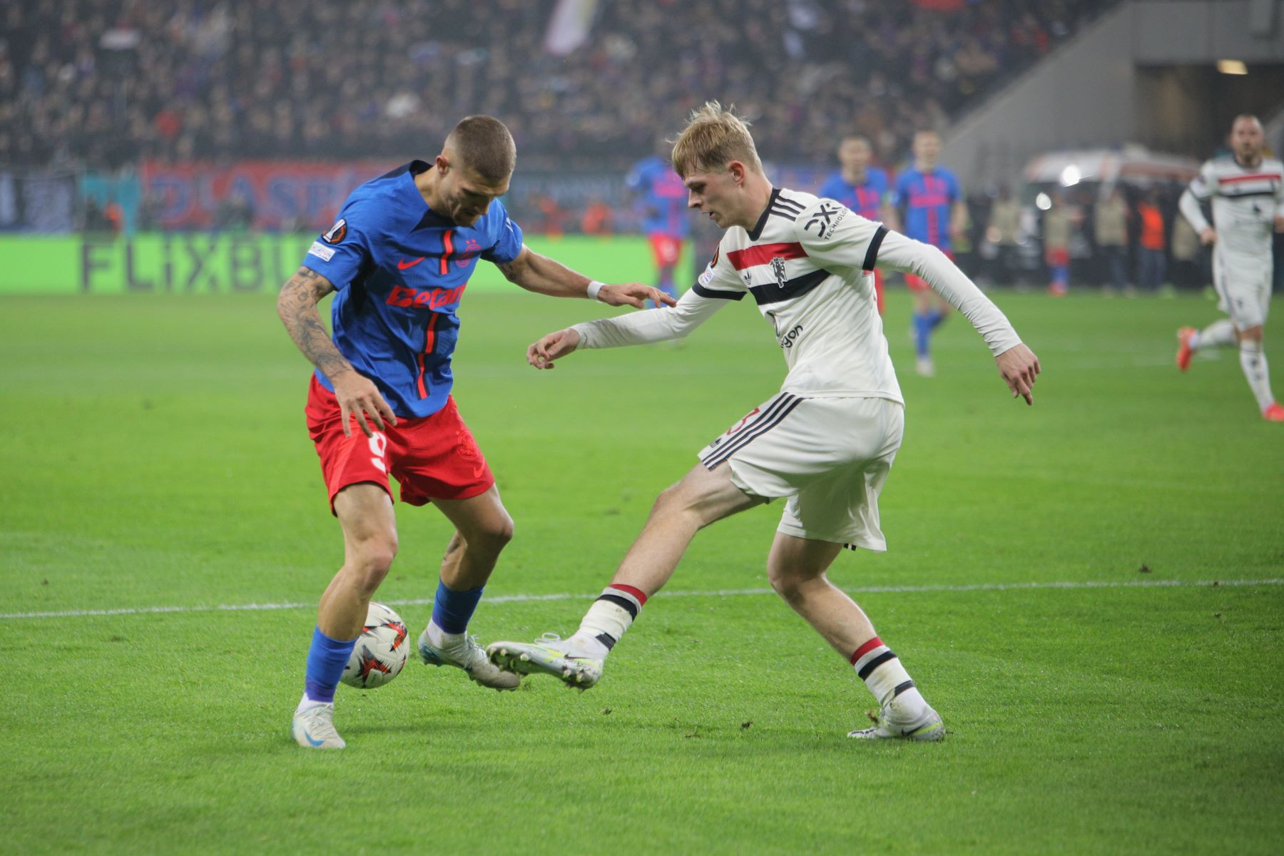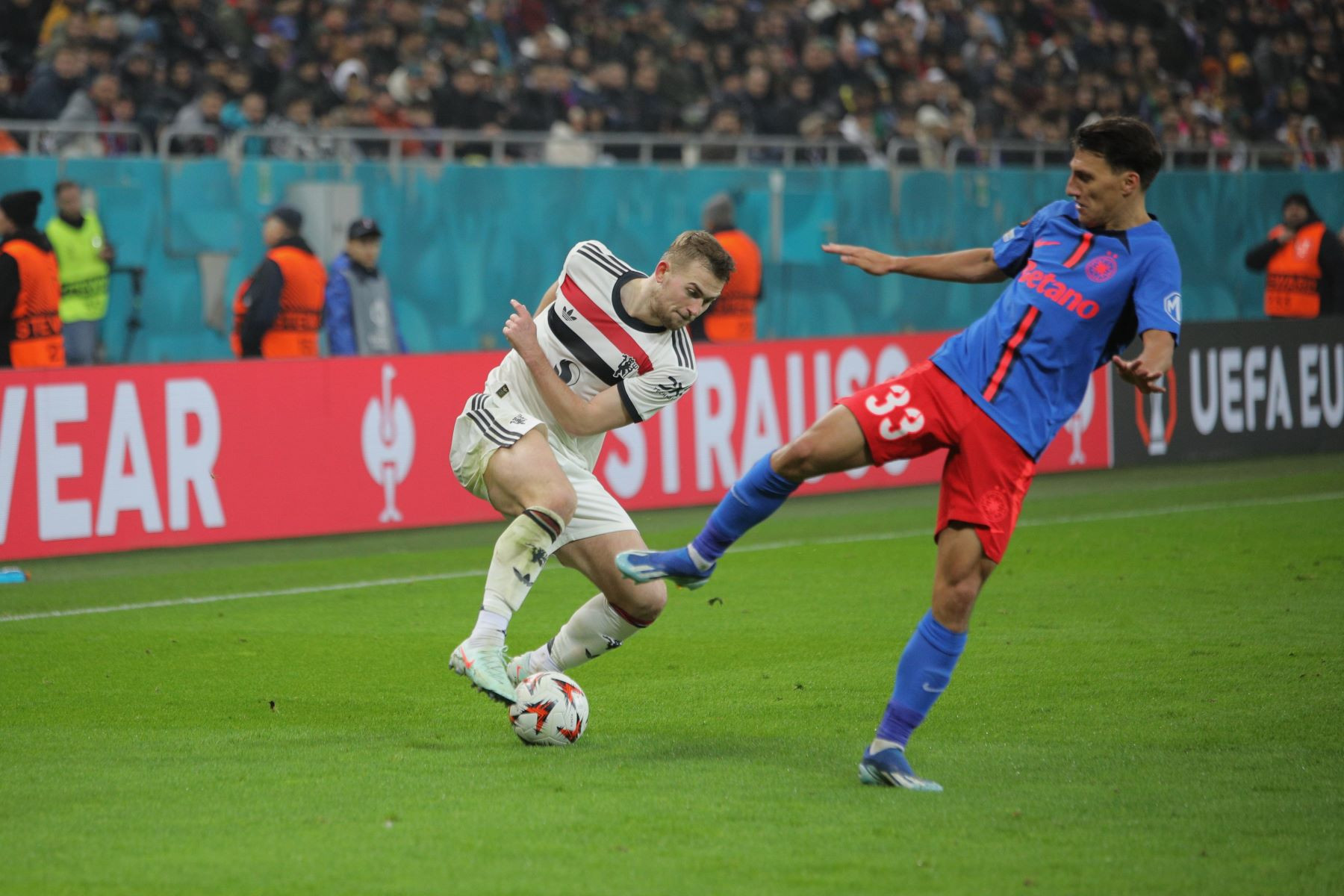 Meciul a fost punctat și de incidente hilare, în care trei tineri fani români ai lui United au intrat pe gazon. Primul a apucat să-și facă poză cu Alejandro Garnacho, al doilea a dat mâna cu Matthijs de Ligt, iar al treilea a alunecat pe iarba umedă și a fost transportat de stewarzi în afara arenei.
