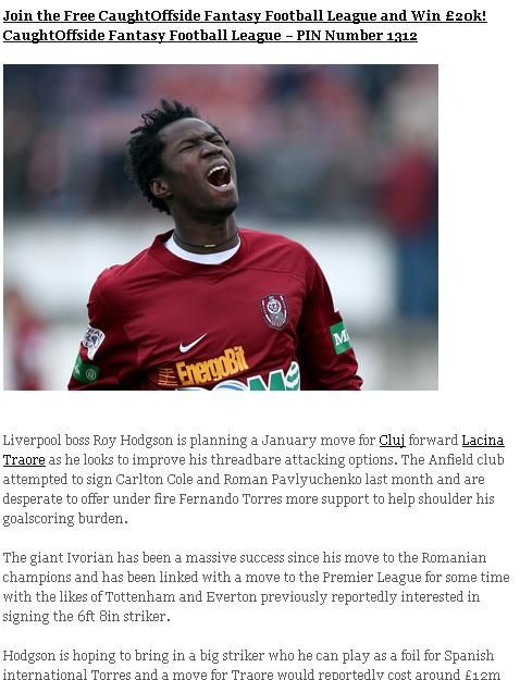 Marcatorul lui CFR Cluj in meciul de aseara cu Basel, Lacina Traore i-a atras atentia lui Roy Roy Hodgson scrie site-ul caughtoffside.com! Antrenorul lui Liverpool si-l doreste pe atacantul ivorian al CFR-ului care a fost si in atentia lui Arsenal.