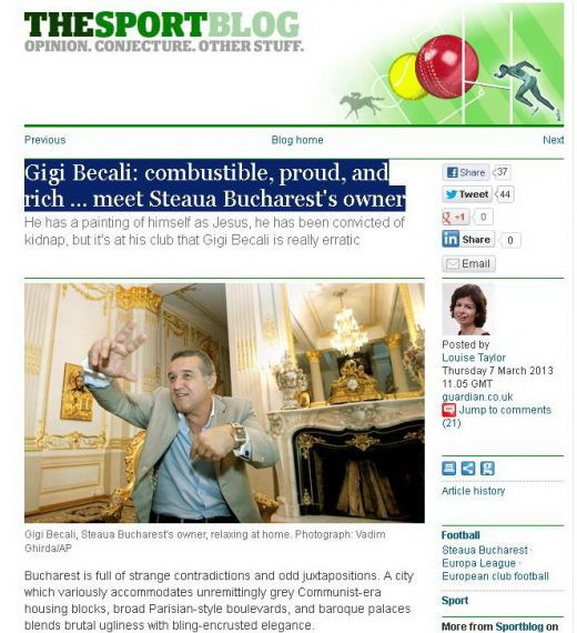 15:15 Gigi Becali a fost vedeta azi pe toate site-urile din Anglia. Si Guardian i-a facut portretul patronului stelist. "Inflamabil, mandru si bogat", e caracterizarea in trei cuvinte pentru Gigi Becali.