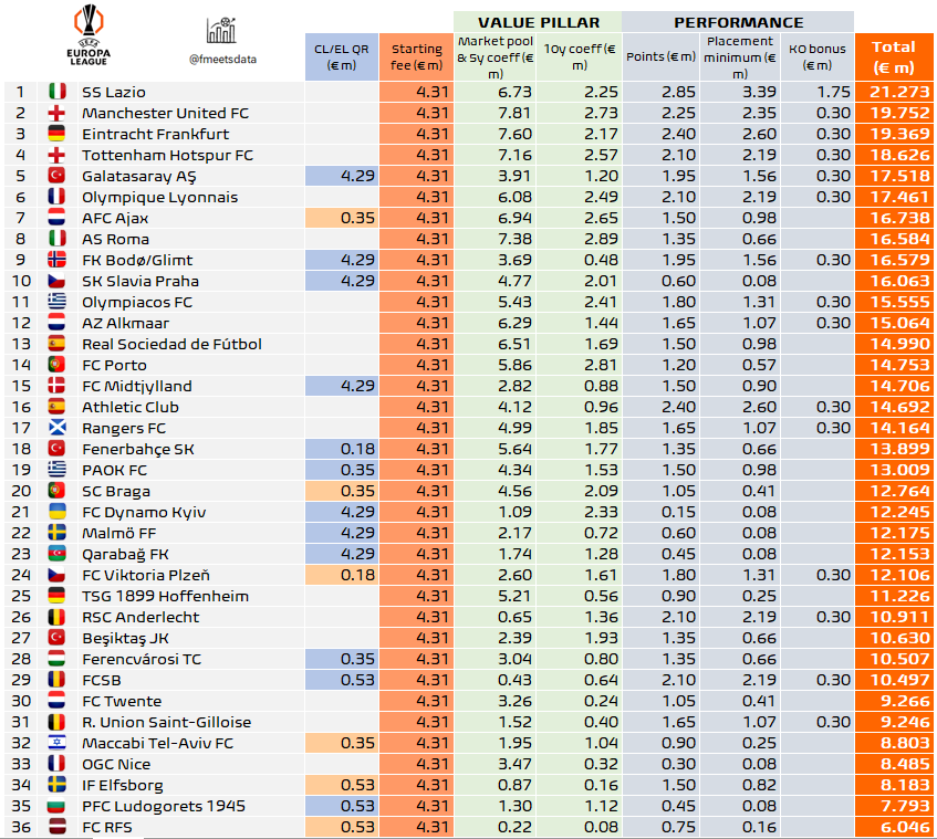 Suma reprezintă a doua cea mai mare recompensă financiară acordată echipelor participante în această etapă a competiției, fiind depășită doar de Lazio, care a încasat 2,87 milioane de euro.