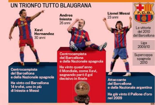 Golul marcat in finala Cupei Mondiale din Africa de Sud ii va aduce lui Iniesta Balonul de Aur, in timp ce Xavi si Messi il urmeaza indeaproape. Fotbalul extraterestru pe care Barcelona l-a aratat cu Real Madrid, l-au scos pe Sneijder de pe podium, chiar daca olandezul a reusit tripla istorica cu Inter si a jucat finala mondialului din Africa de Sud.