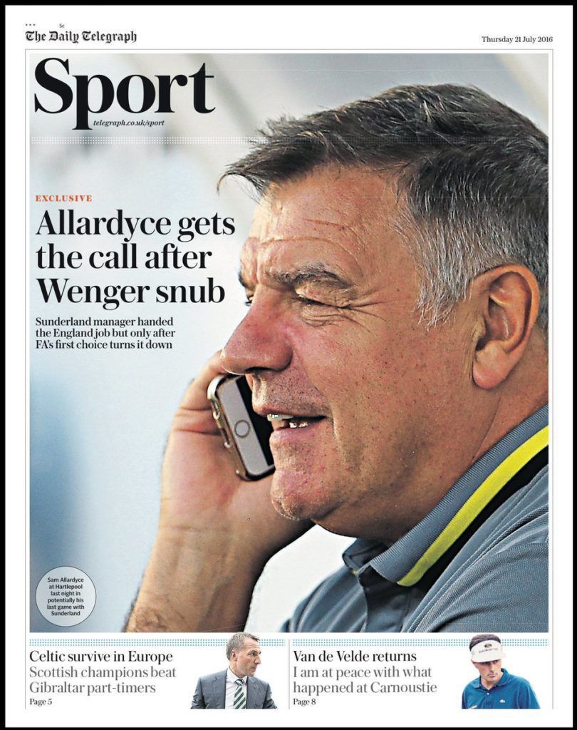 Federatia Engleza a recurs la Big Sam dupa ce a fost refuzata de Arsene Wenger. Francezul a refuzat postul de selectioner pentru ca inca mai spera ca va cuceri un titlu inainte de a pleca de la Arsenal. Wenger le-a promis insa englezilor ca va antrena echipa nationala intr-o zi.