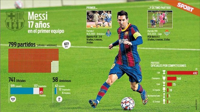 La ultima partida dintre cele doua de pe Camp Nou, Messi a marcat o dubla in Barcelona 2-2 Atletico Madrid. Messi a inscris de 677 de ori (incluzandu-se si meciurile amicale) in 799 de partide, avand o medie de 0.84 goluri pe meci.