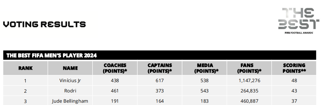 Pe baza unei medii, Vinicius Junior, starul lui Real Madrid, a încheiat pe prima poziție, cu 48 de puncte, urmat de Rodri (Manchester City, 43 de puncte) și Jude Bellingham (Real Madrid, 37 de puncte).