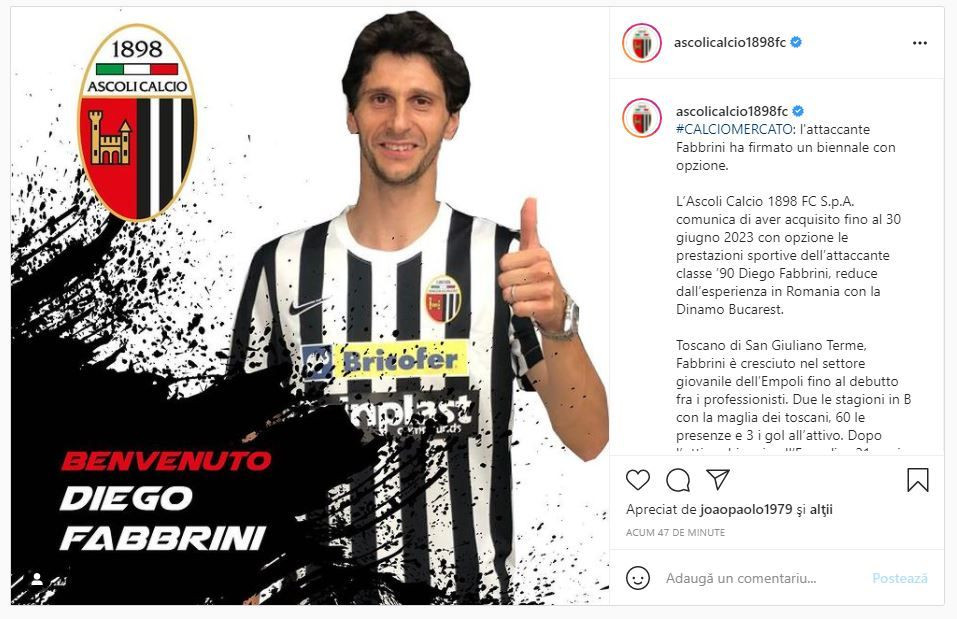 "Fabbrini a semnat un contract pe doi ani de zile. Ascoli Calcio 1898 FC anunta ca a semnat un contract valabil pana in 30 iunie 2023 cu Diego Fabbrini, dupa ce acesta s-a despartit de Dinamo Bucuresti", se arata in comunicatul italienilor.