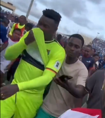 După fluierul final, sute de fani au intrat pe teren pentru a sărbători victoria istorică. Unul dintre ei a încercat să facă un selfie cu Onana, însă portarul nu și-a păstrat calmul.