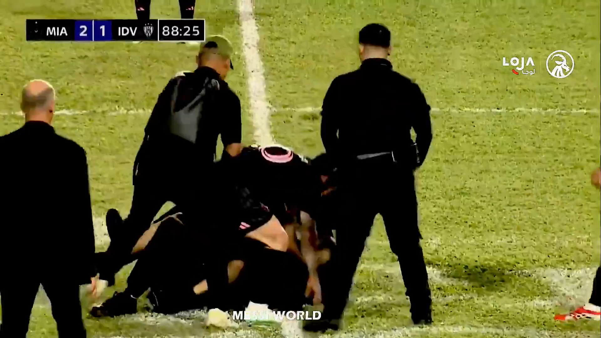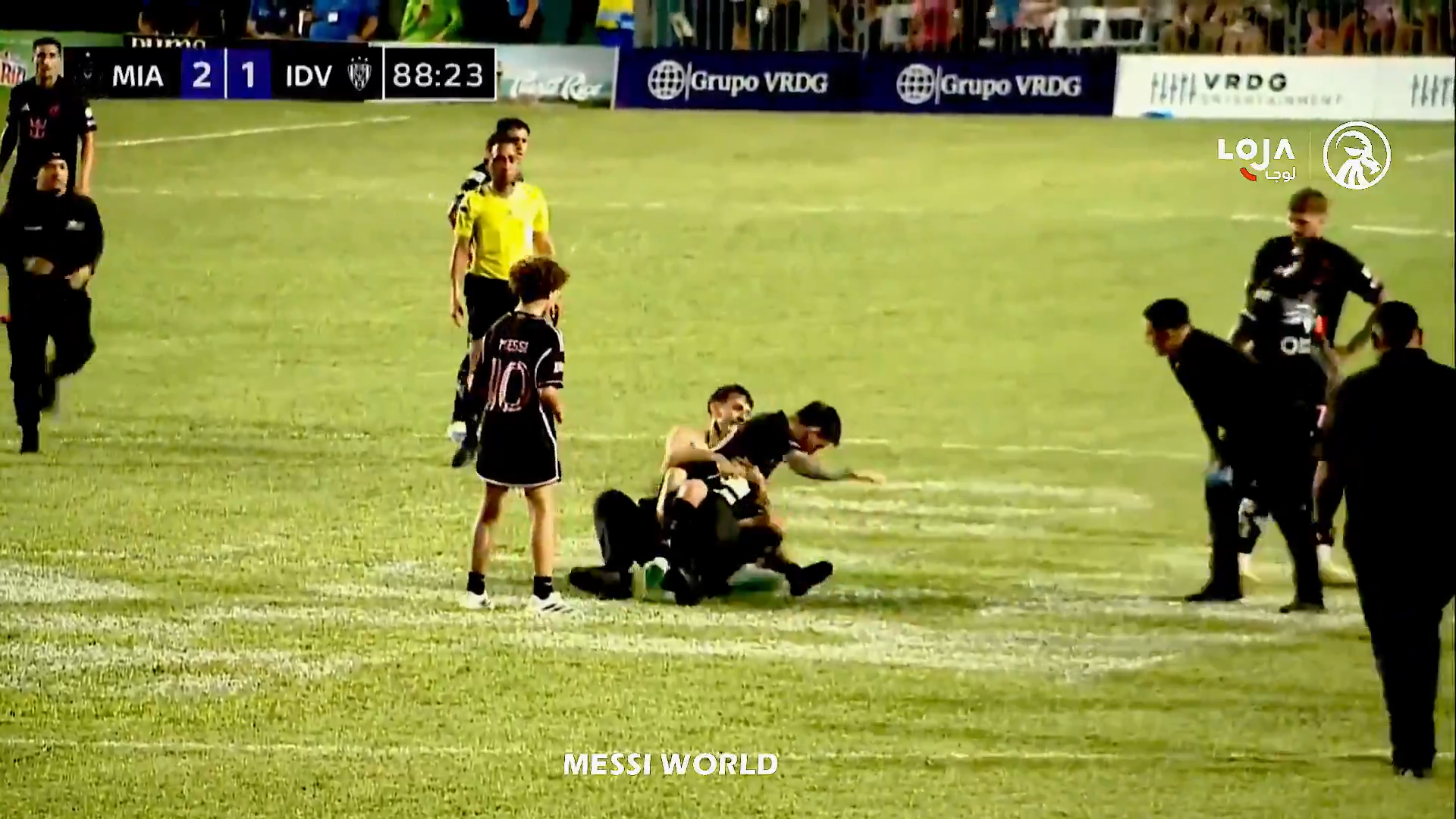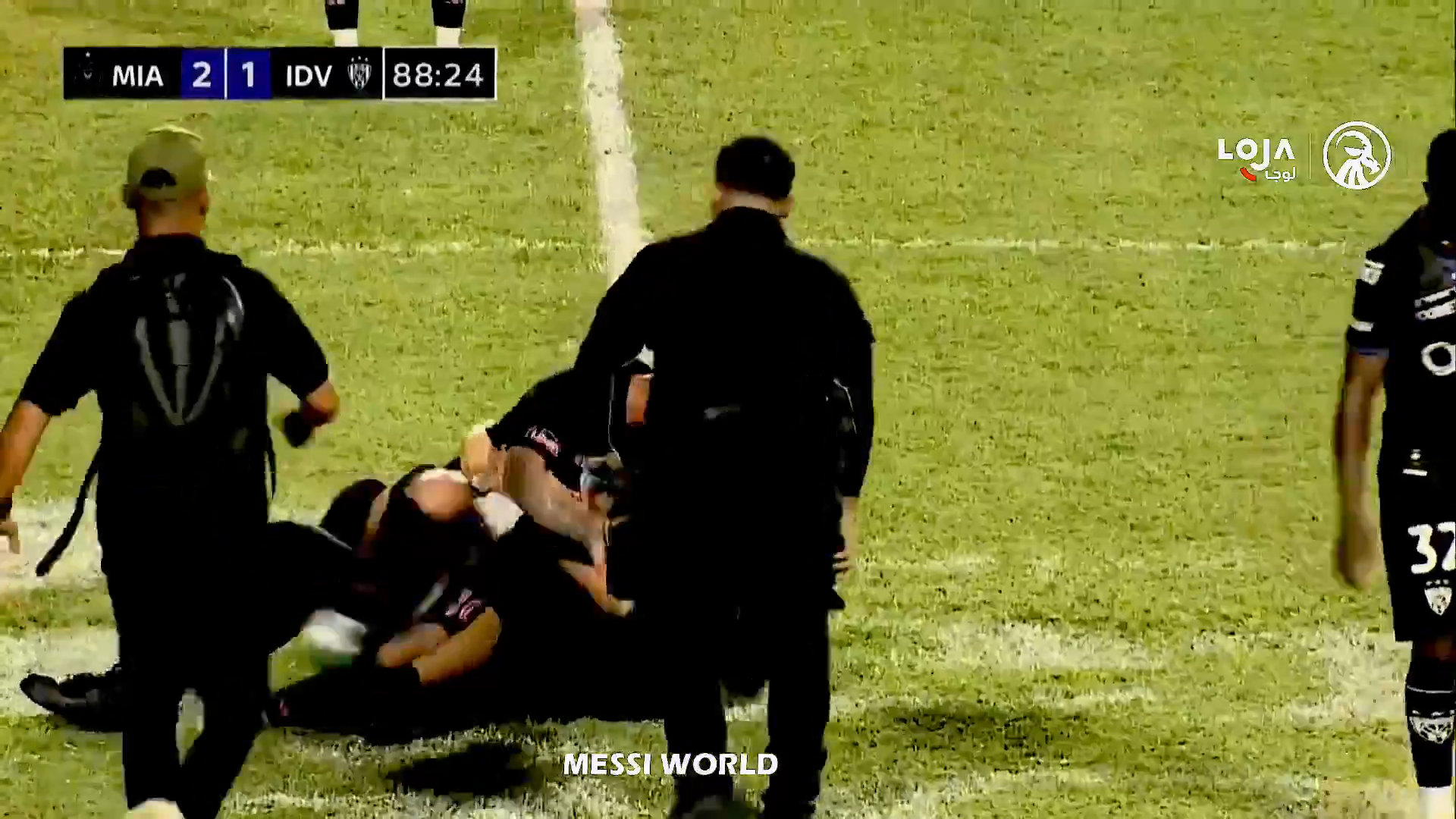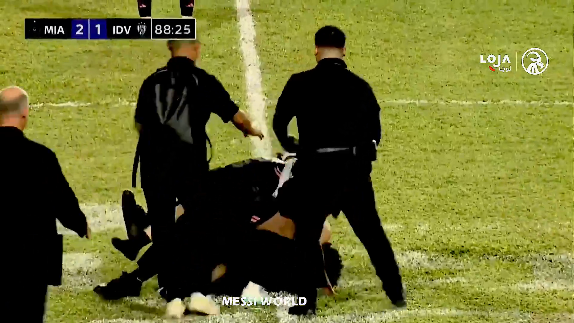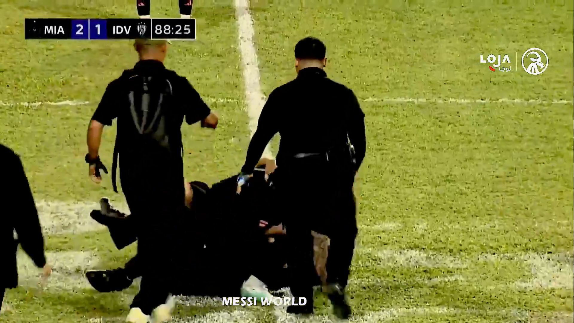 Un steward a văzut ce se petrece și a dorit să intervină, dar a ajuns prea târziu, a încercat să îl tragă pe tânărul fan de lângă Messi, dar bărbatul l-a ținut strâns pe argentinian. În toată agitația, toți trei au căzut pe gazon, inclusive Leo Messi.