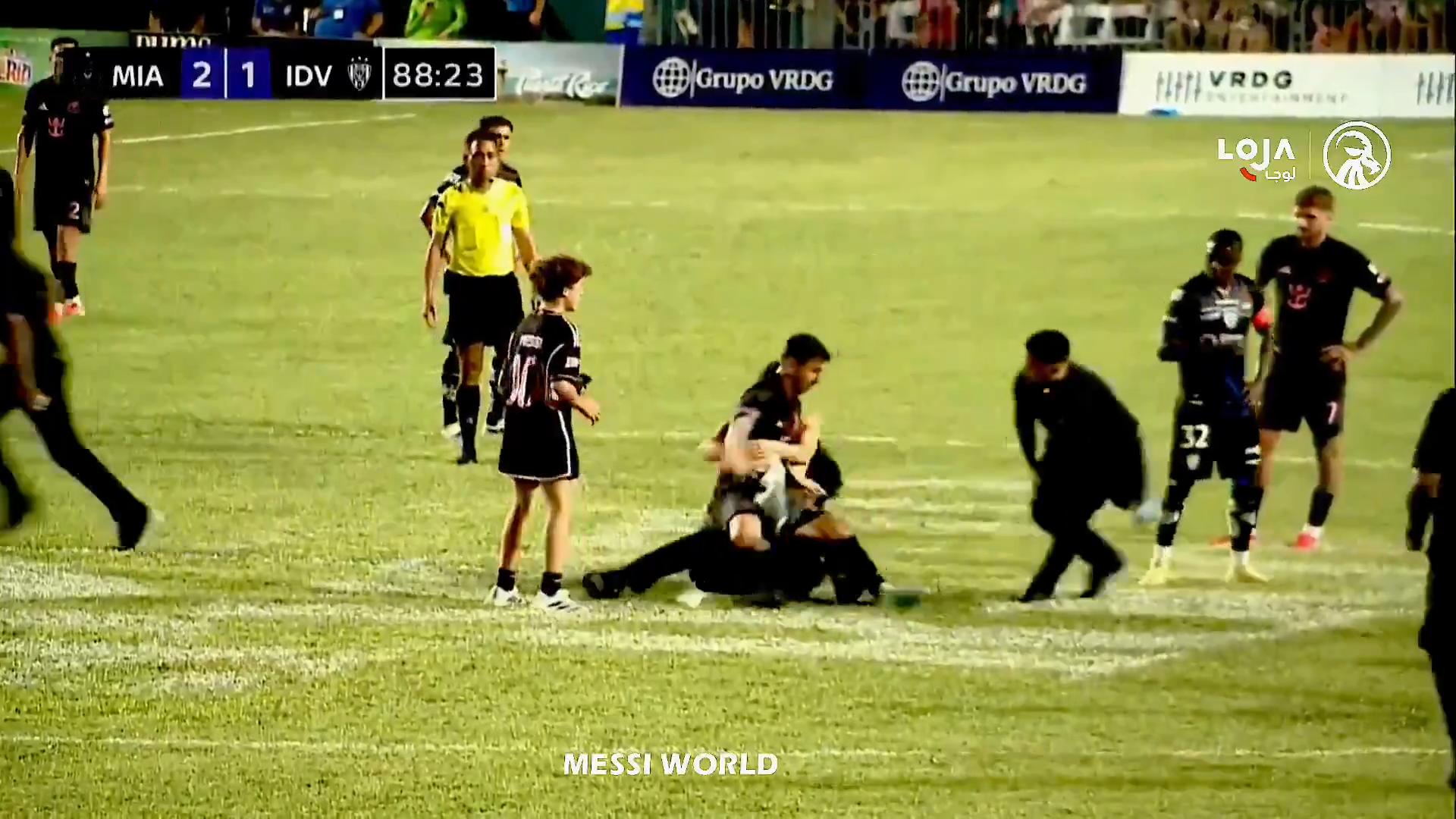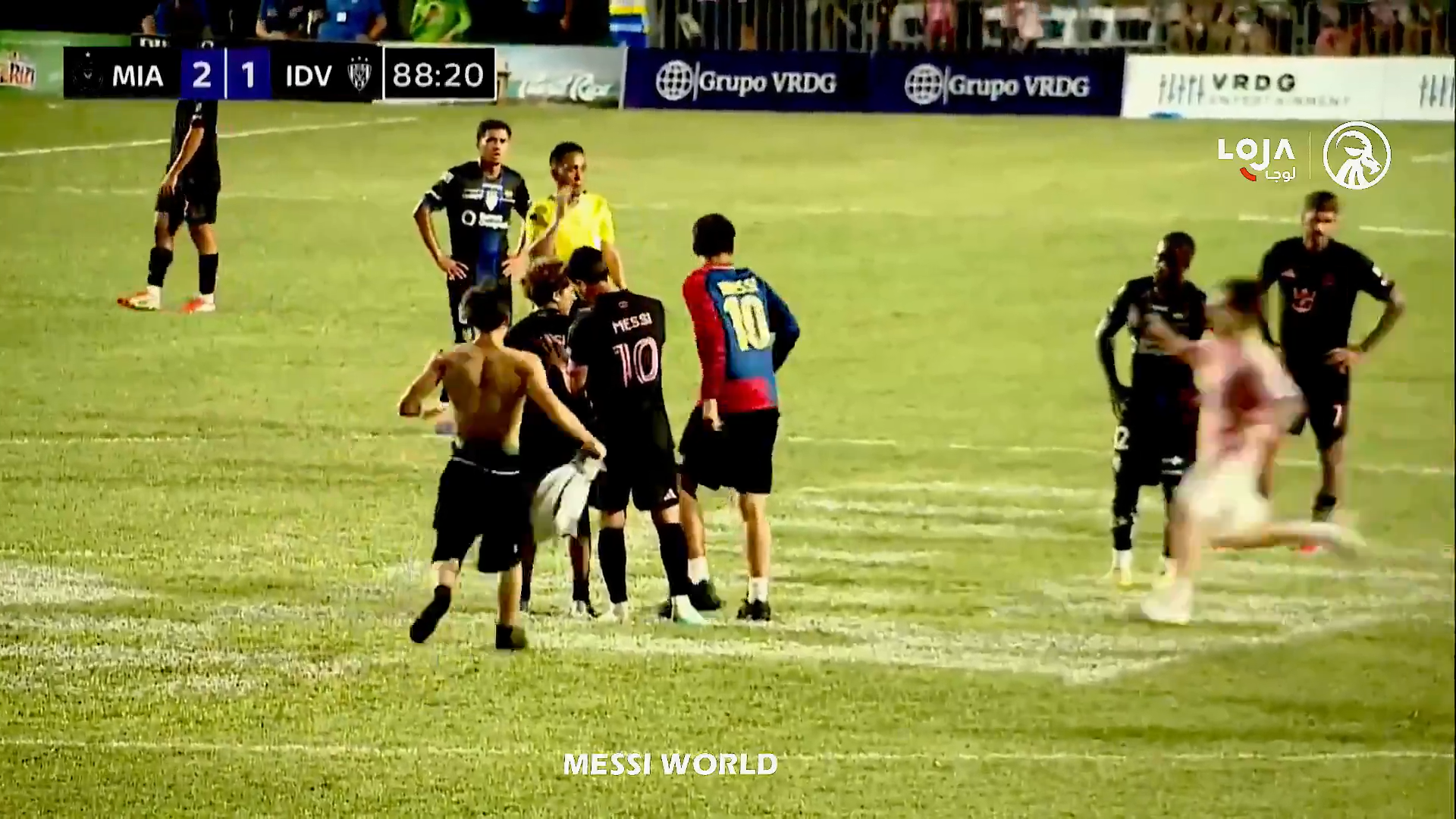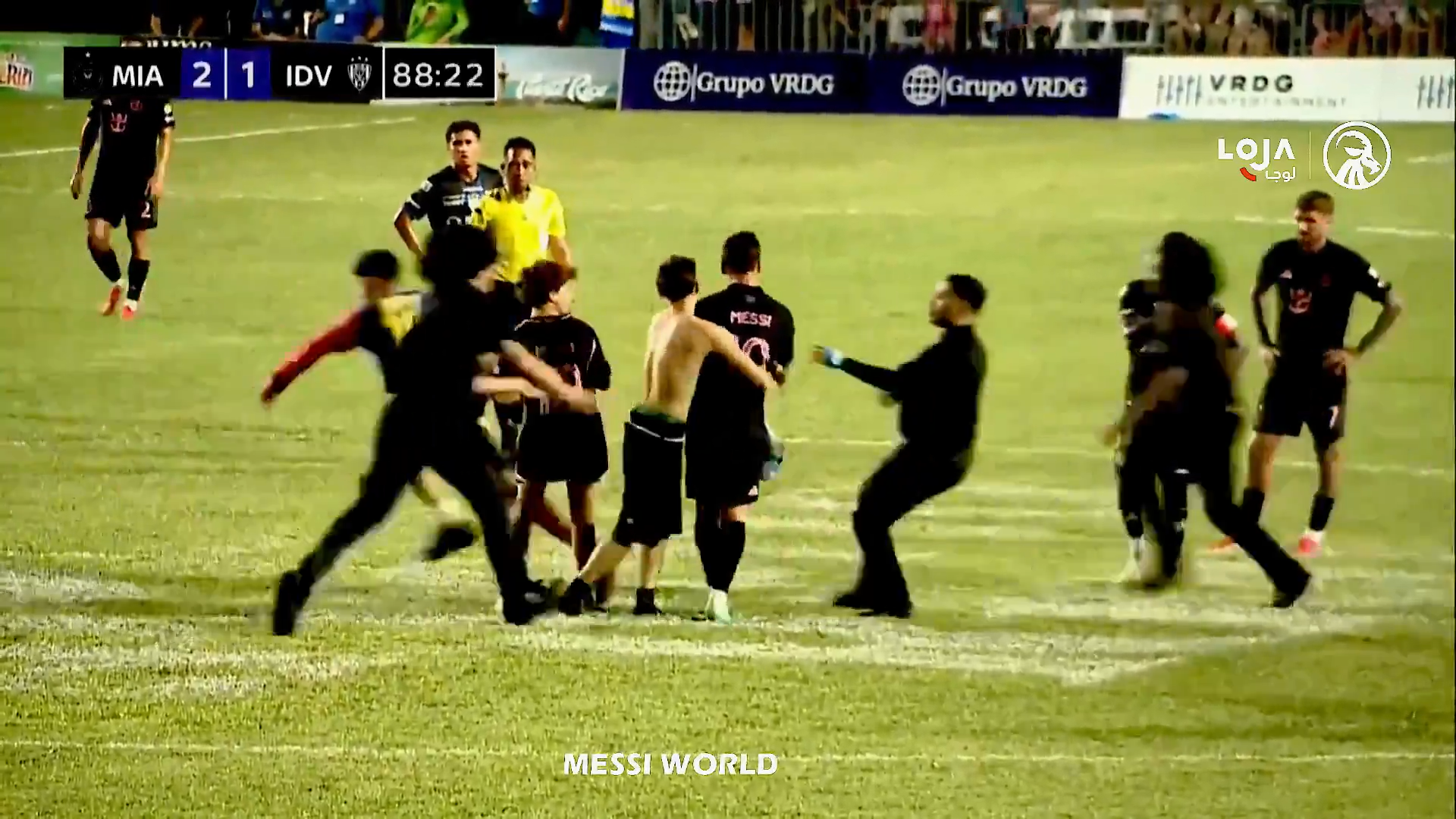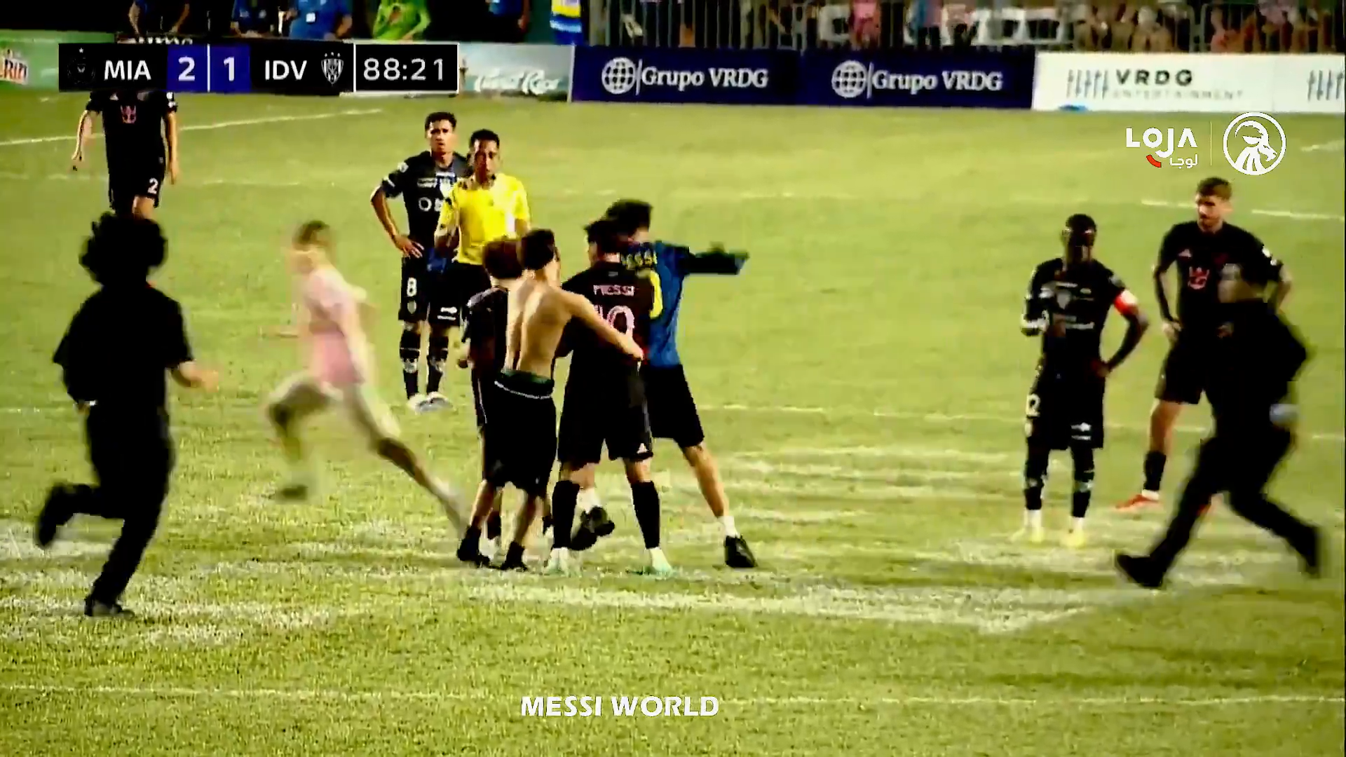 Un steward a văzut ce se petrece și a dorit să intervină, dar a ajuns prea târziu, a încercat să îl tragă pe tânărul fan de lângă Messi, dar bărbatul l-a ținut strâns pe argentinian. În toată agitația, toți trei au căzut pe gazon, inclusive Leo Messi.