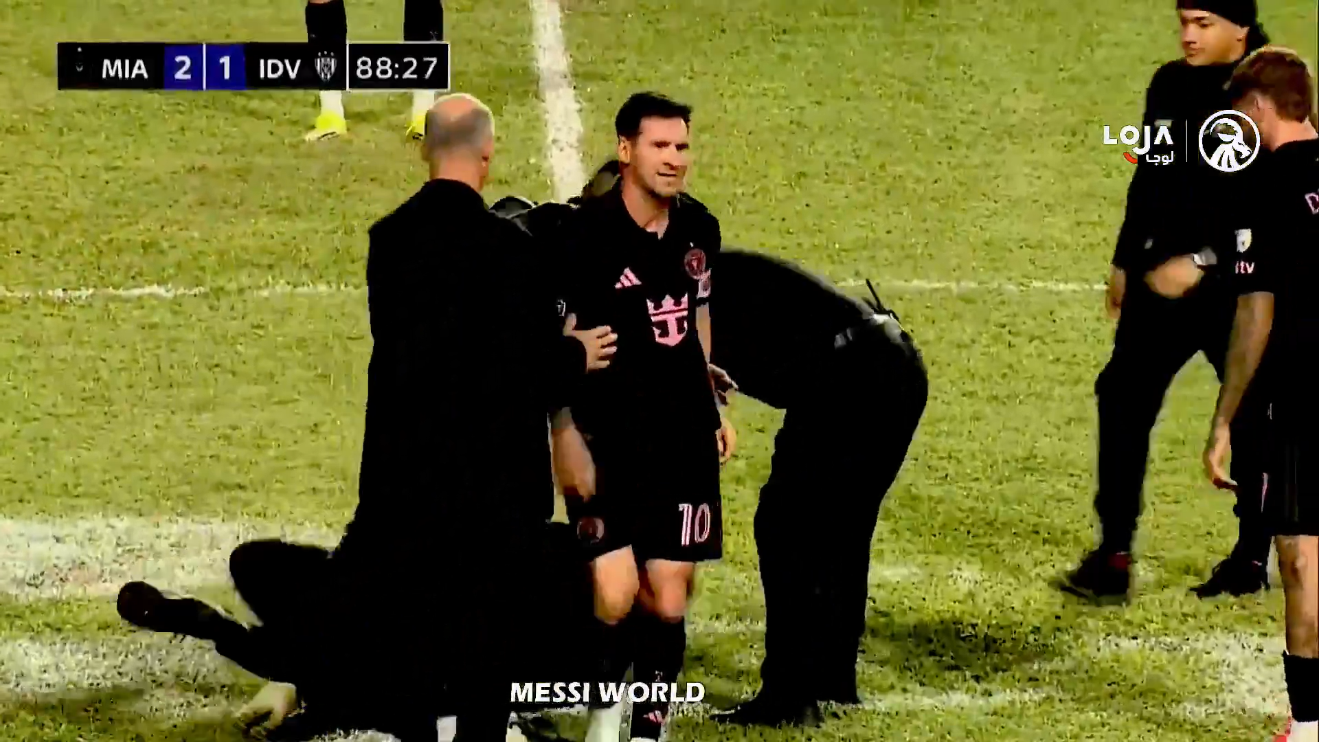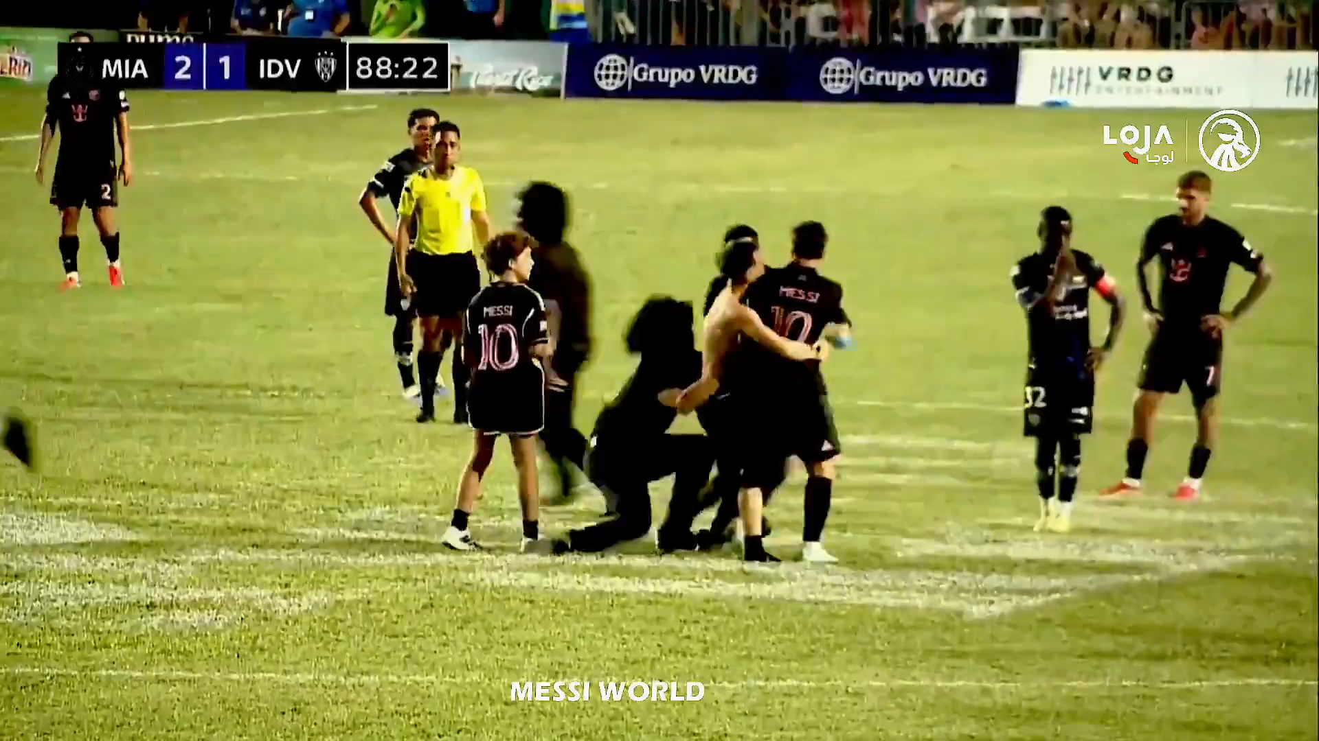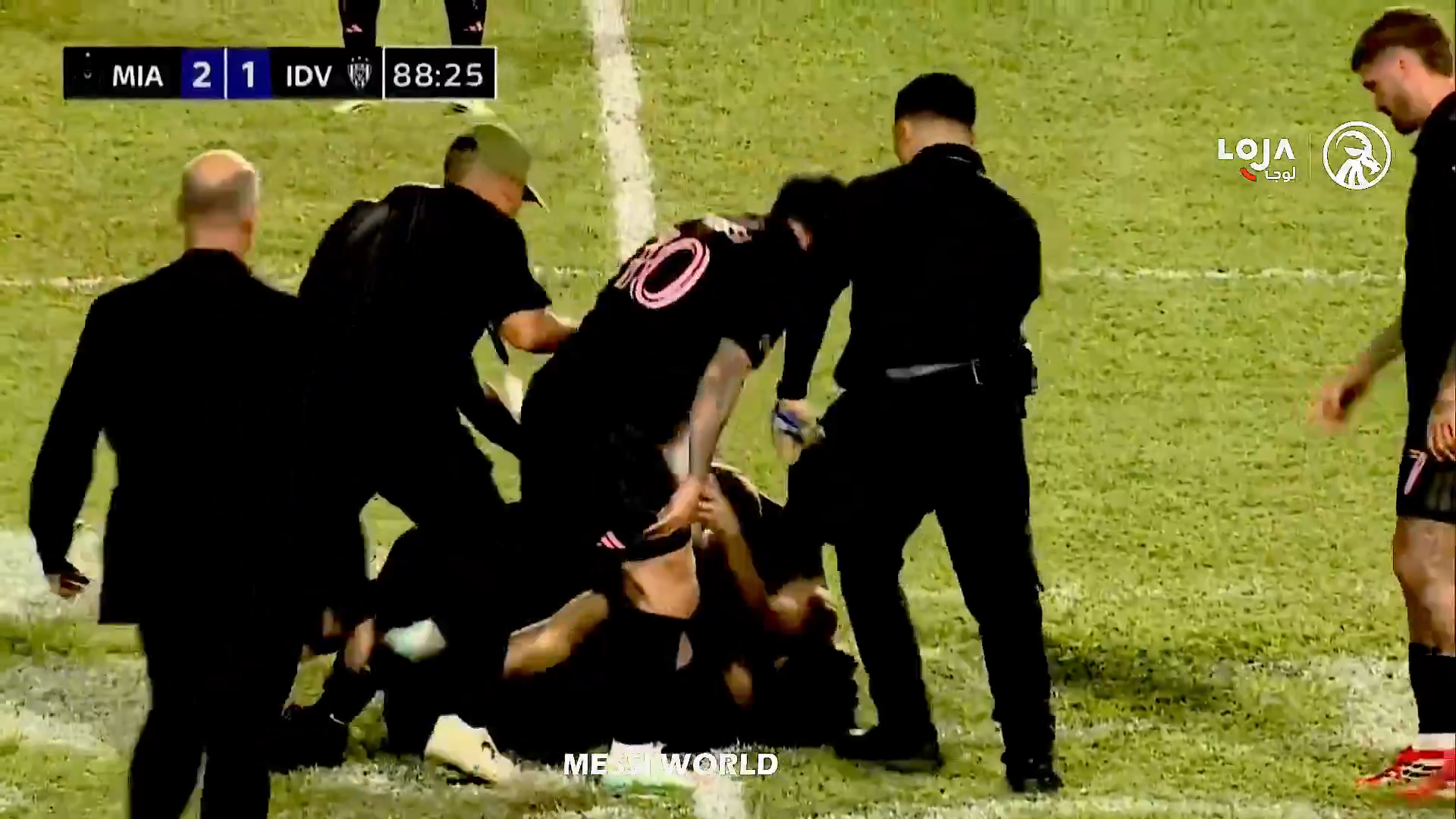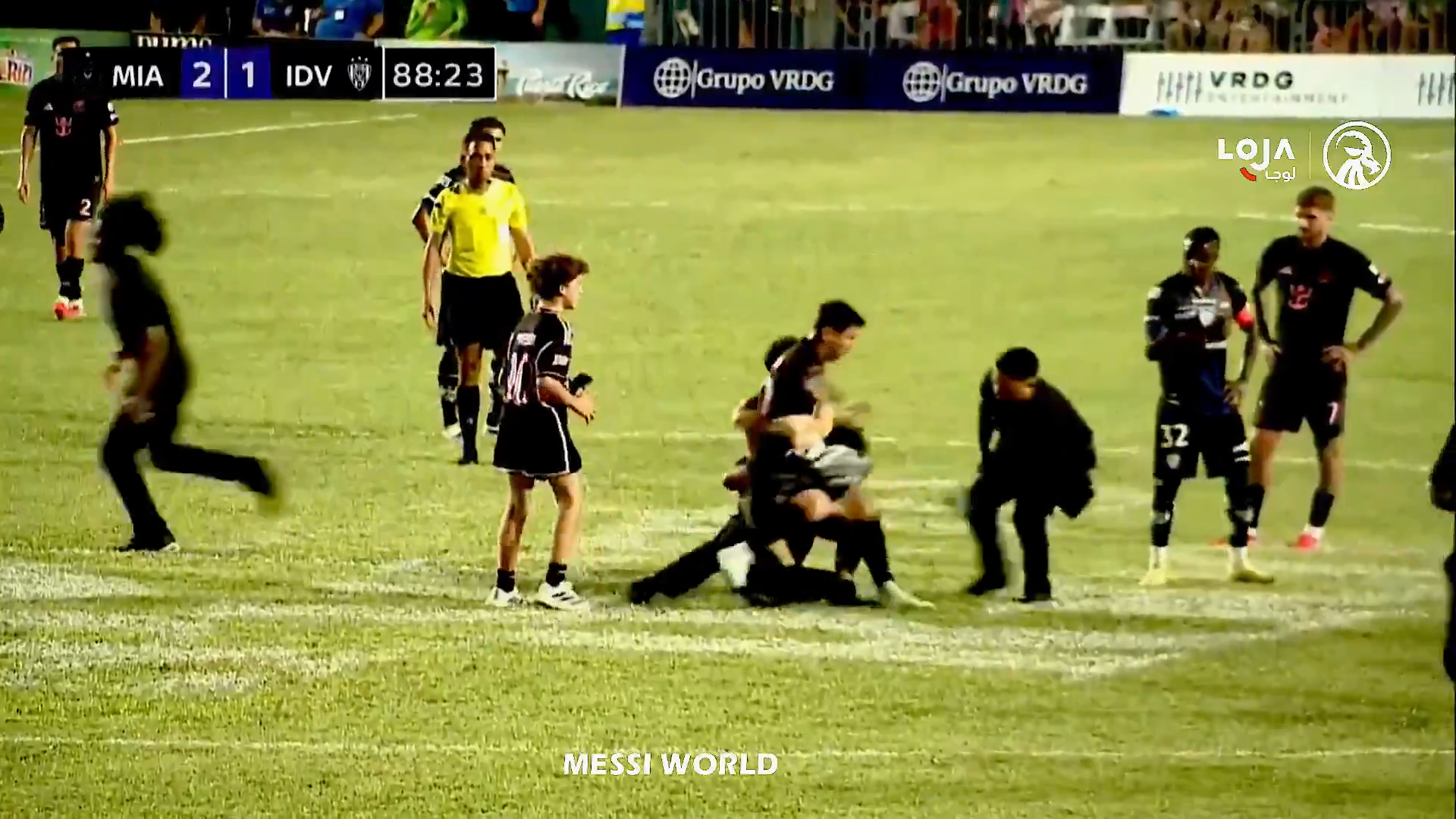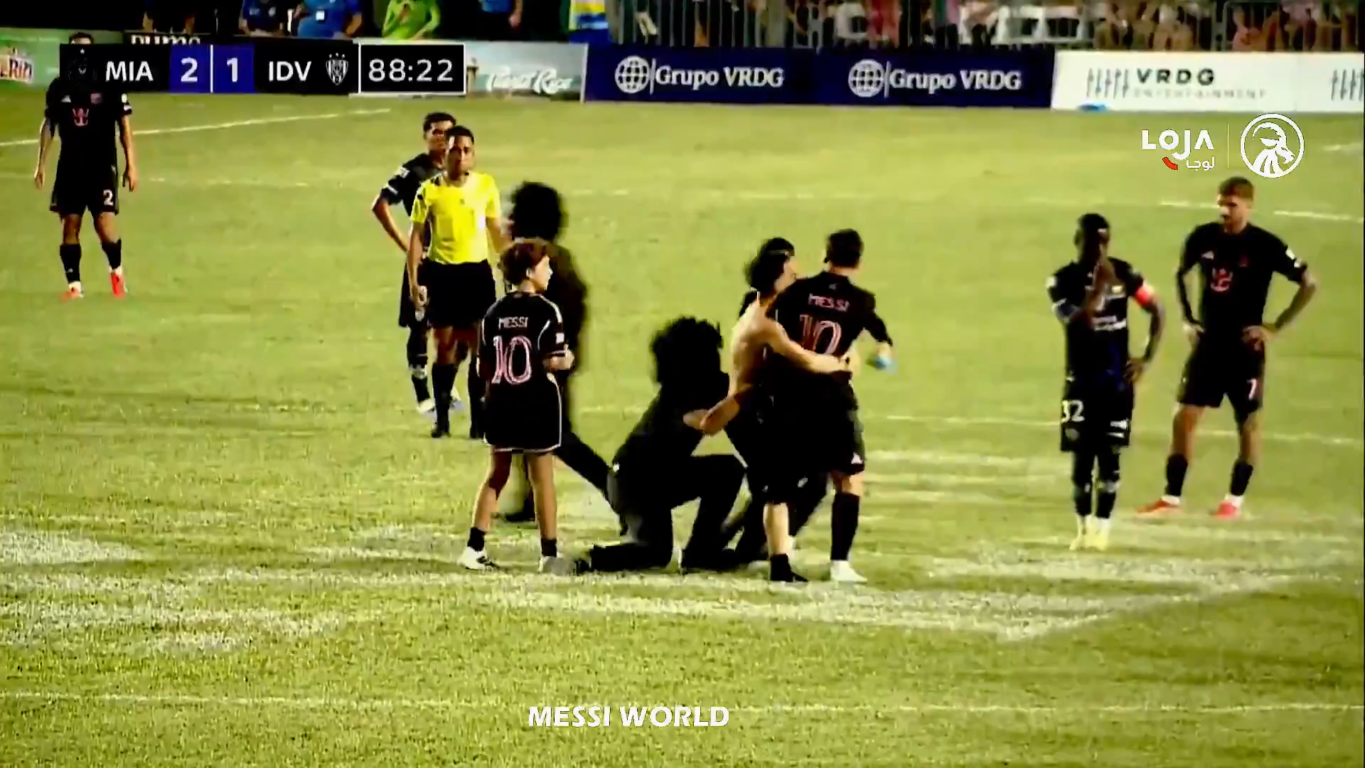 Un steward a văzut ce se petrece și a dorit să intervină, dar a ajuns prea târziu, a încercat să îl tragă pe tânărul fan de lângă Messi, dar bărbatul l-a ținut strâns pe argentinian. În toată agitația, toți trei au căzut pe gazon, inclusive Leo Messi.