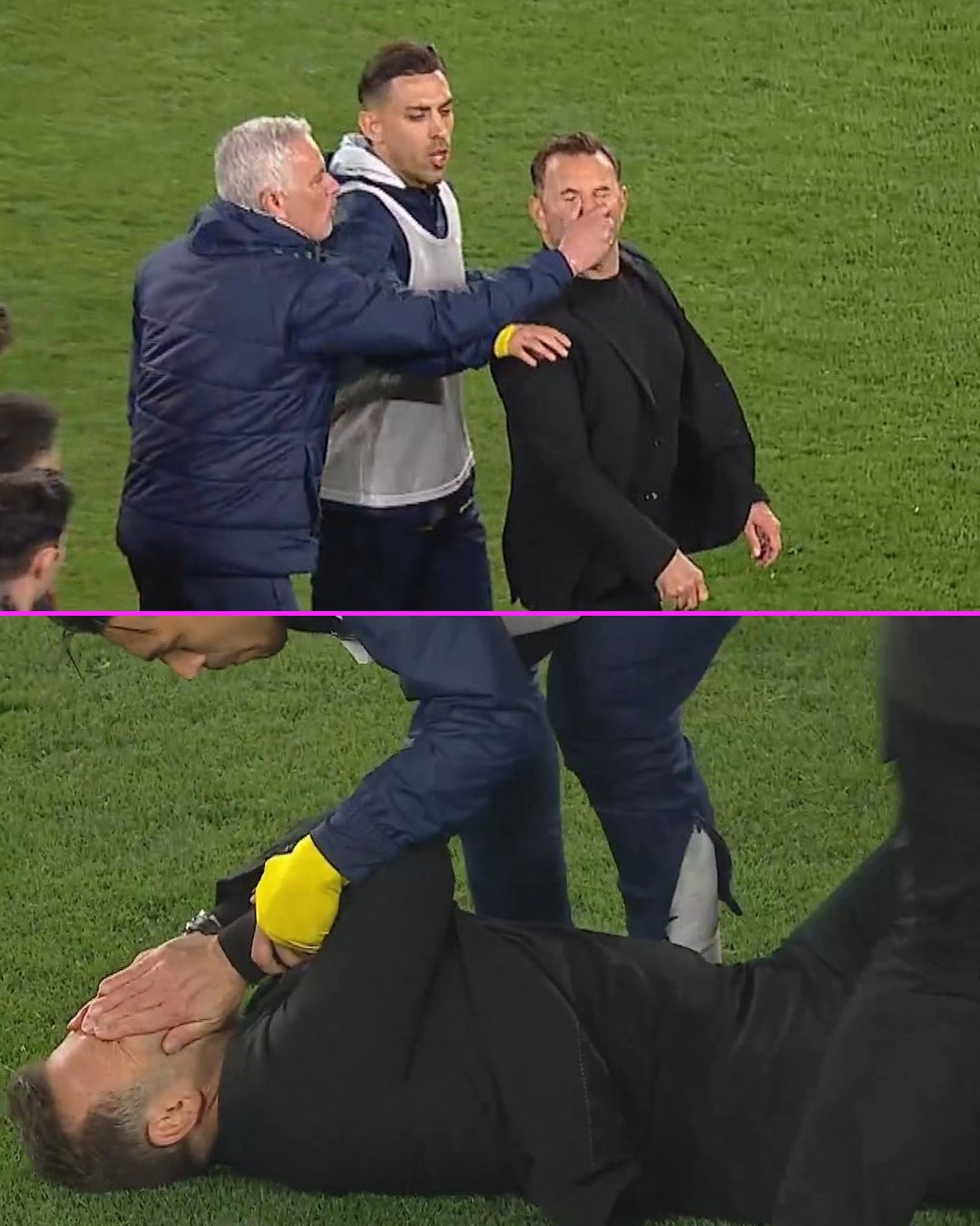 Buruk a exagerat la momentul respectiv și s-a prăbușit pe gazon, simulând o lovitură puternică încasată din partea lui Mourinho: "Am fost precum un jucător, m-am aruncat pe gazon. Am exagerat puțin, dar nu mă așteptam să facă asta. Dădeam mâna cu arbitrii și mă îndreptam spre peluză pentru a sărbători victoria, moment în care el a venit la mine și a făcut asta", explică acum Okan Buruk, într-un interviu pentru The Athletic.