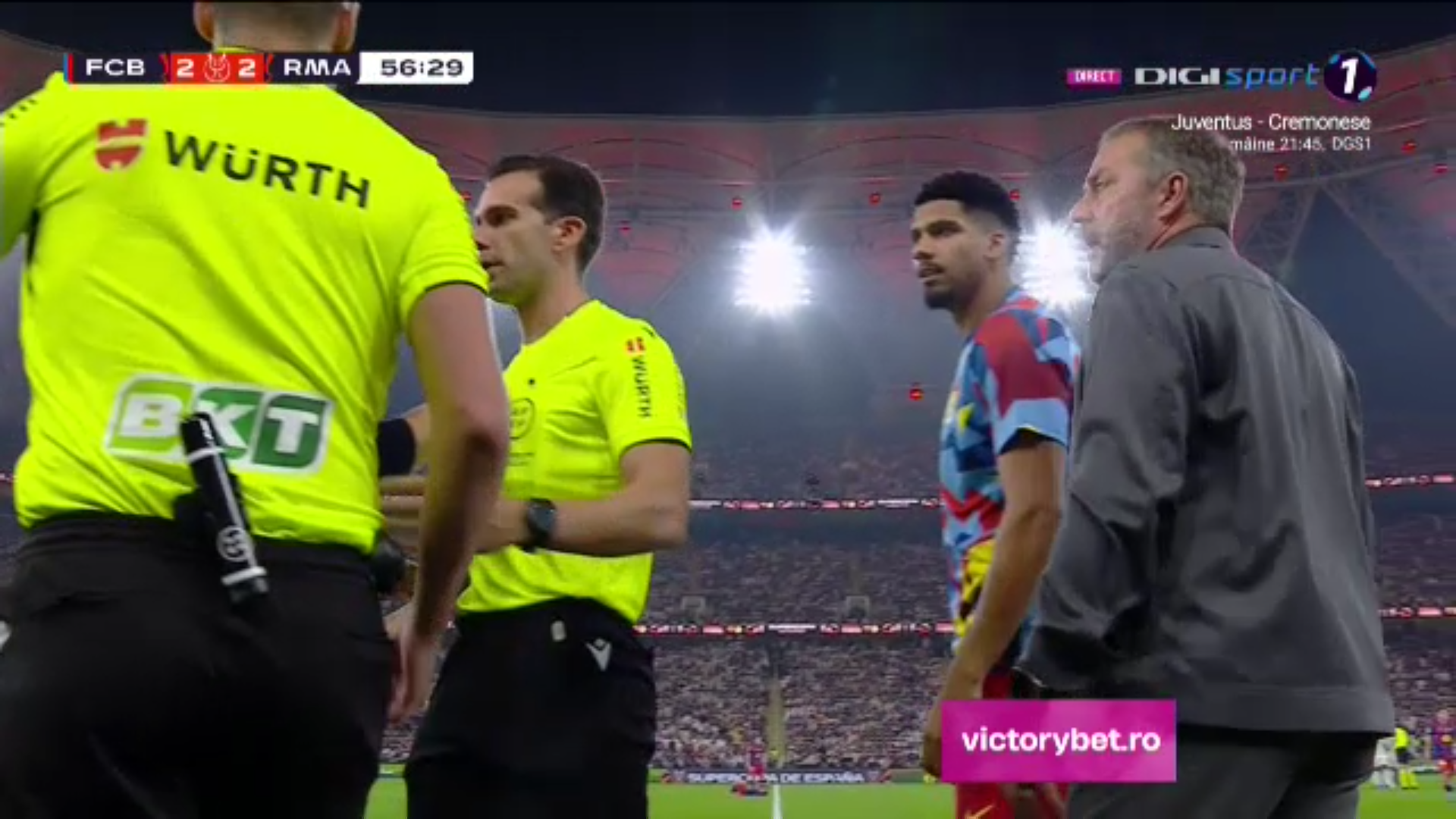 Spiritele s-au încins și la marginea terenului. Hansi Flick le-a cerut explicații arbitrilor, lucru ce nu i-a convenit lui Xabi Alonso care a intrat într-un conflict verbal cu omologul său de pe banca Barcelonei. Ronald Araujo s-a implicat și el de partea lui Flick, însă în ajutorul lui Xabi Alonso a venit imediat Dani Carvajal.