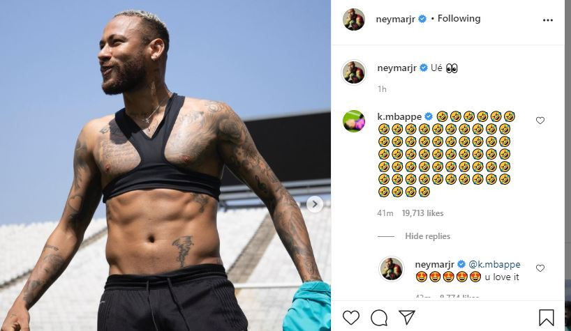 La poză i-a lăsat un comentariu și Kylian Mbappe, cel care a părăsit cantonamentul Franței după ce s-a accidentat în meciul cu Bosnia. Francezul i-a lăsat numeroase emoji-uri care râdeau, la care Neymar i-a replicat cu: „Îți place”.