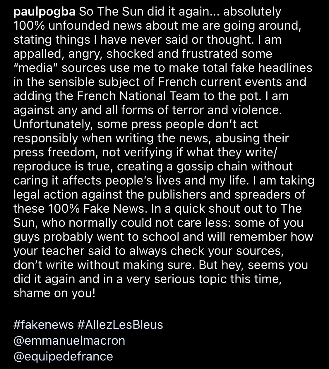 "Din pacate, o parte din presa nu i-a act de responsabilitate cand scrie stiri, abuzand de libertatea de exprimare, neverificand daca ce au scris sau reprodus este adevarat, creand un lant de barfe care afecteaza toti oamenii din viata mea. O sa iau o actiune legale impotriva celor care publica sau impart acest minciuni. Intr-o ultima strigare pentru The Sun, probabil cand ati mers la scoala va puteti aduce aminte cand profesorul va spunea sa va verificati sursele, ca sa nu scrieti ceva ce nu este sigur. Dar hey, se pare ca ati comis-o din nou intr-un mod cat se poate de serios de aceasta data, sa va fie rusine!", a declarat Paul Pogba pe retelele de socializare.
