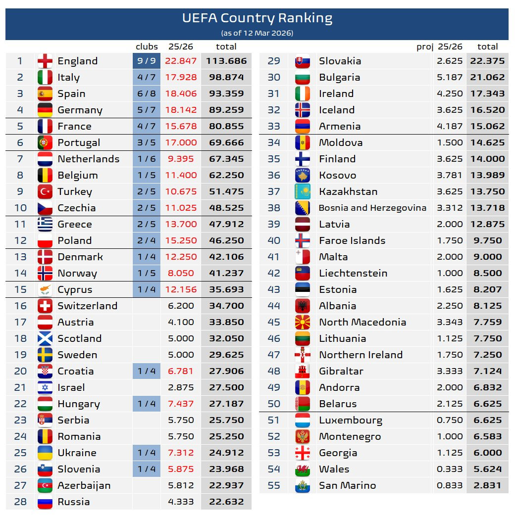 De partea cealaltă, Ferencvaros a reușit practic de una singură să ridice coeficientul Ungariei. Din totalul de 29.750 de puncte, 23.750 sunt obținute de echipa lui Robbie Keane. Celelalte au fost aduse de Paksi și Gyor (ambele cu 3.000), în timp ce Puskas Akademia a fost eliminată din turul 2 de Conference League și nu a punctat deloc.