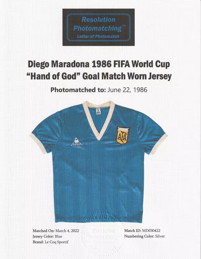 Resolution Photomatching a reușit să realizeze o potrivire fotografică concludentă la celebrarea golului „Mâna lui Dumnezeu”. Aceștia au stabilit că Maradona a schimbat tricourile în timpul meciului, dar Maradona a purtat acest tricou pentru ambele goluri istorice din a doua jumătate a meciului.