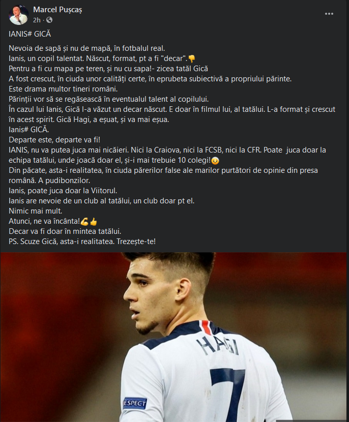 Marcel Puscas a postat un mesaj dur la adresa lui Ianis Hagi pe pagina sa de Facebook.
