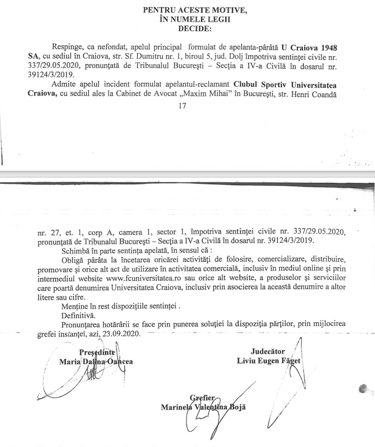In urma deciziei pronuntate de Curtea de Apel Bucuresti, echipa din Liga 2 trebuie sa isi schimbe numele, fiind obligata sa isi inceteze activitatea de folosire, comercializare, distribuire si promovar a produselor si serviciilor care poarta denumirea Universitatea Craiova.