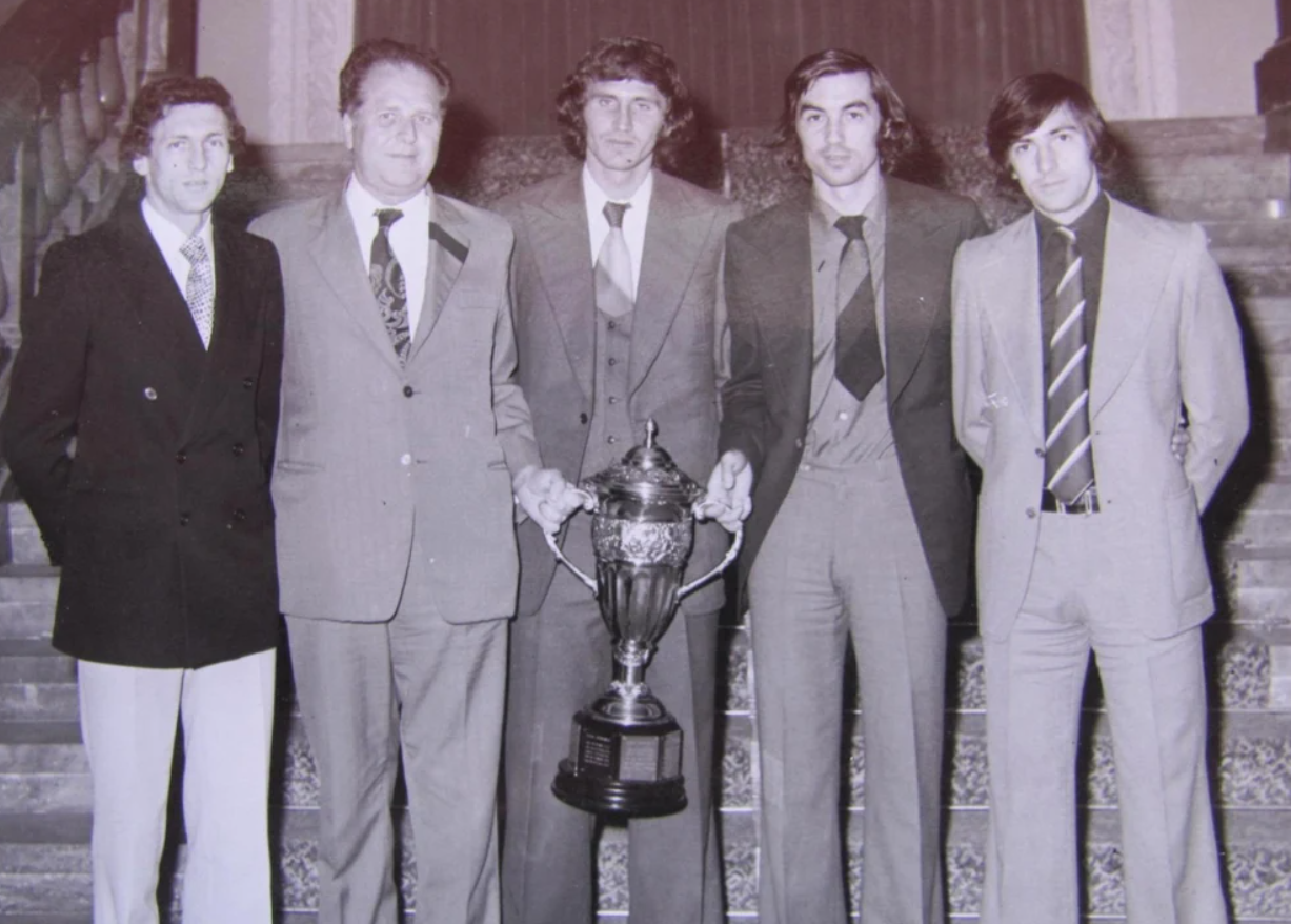 - Emeric Dembroschi (foto stânga), după ce Poli Timişoara a câștigat Cupa României în 1980