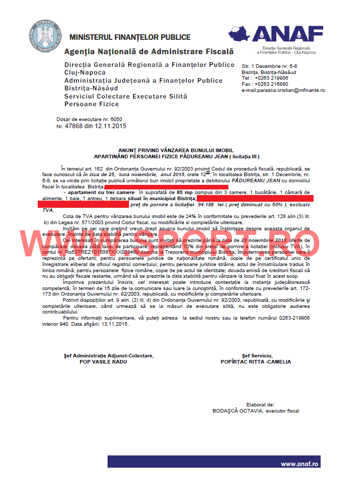 "Apartament cu trei camere in suprafata de 85 mp, compus din 3 camere, 1 bucatarie, 1 camara de alimente, 1 baie, 1 antreu si 1 debara. Pretul de pornire a licitatiei 94.188 lei (pret diminuat cu 50%), exclusiv TVA", se arata in decizia ANAF.
