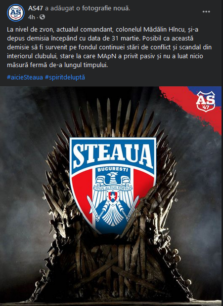 "E posibil ca aceasta demisie sa fi survenit pe fondul continuei stari de conflict si scandal din interiorul clubului, stare la care MApN a primit pasiv si nu a luat nicio masura ferma de-a lungul timpului", scrie AS 47 pe pagina de Facebook.