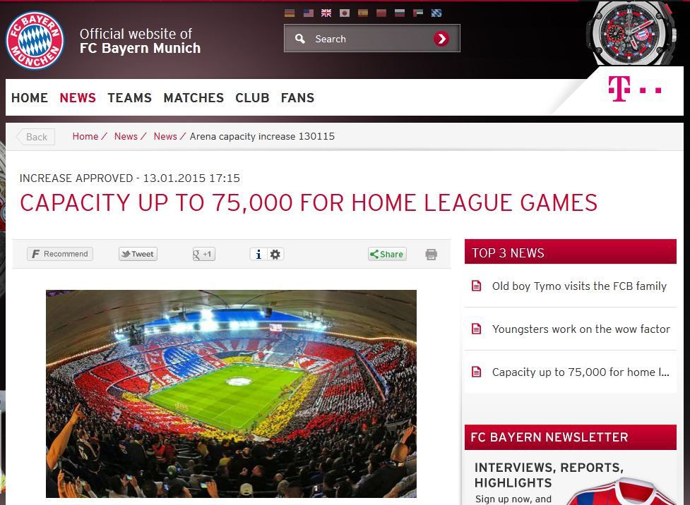 In Bundesliga, modificarile aduse la Allianz Arena vor face ca numarul de locuri sa creasca de la 68.000 la 75.000 de locuri. In campionatul din Germania, clubul a primit acordul de a juca fara scaune in toate sectoarele.