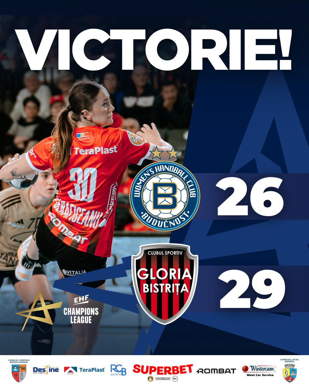 Gloria Bistriţa a învins în deplasare echipa muntenegreană OTP Group Buducnost Podgorica, cu scorul de 29-26 (13-16), duminică, în Grupa A a Ligii Campionilor la handbal feminin.