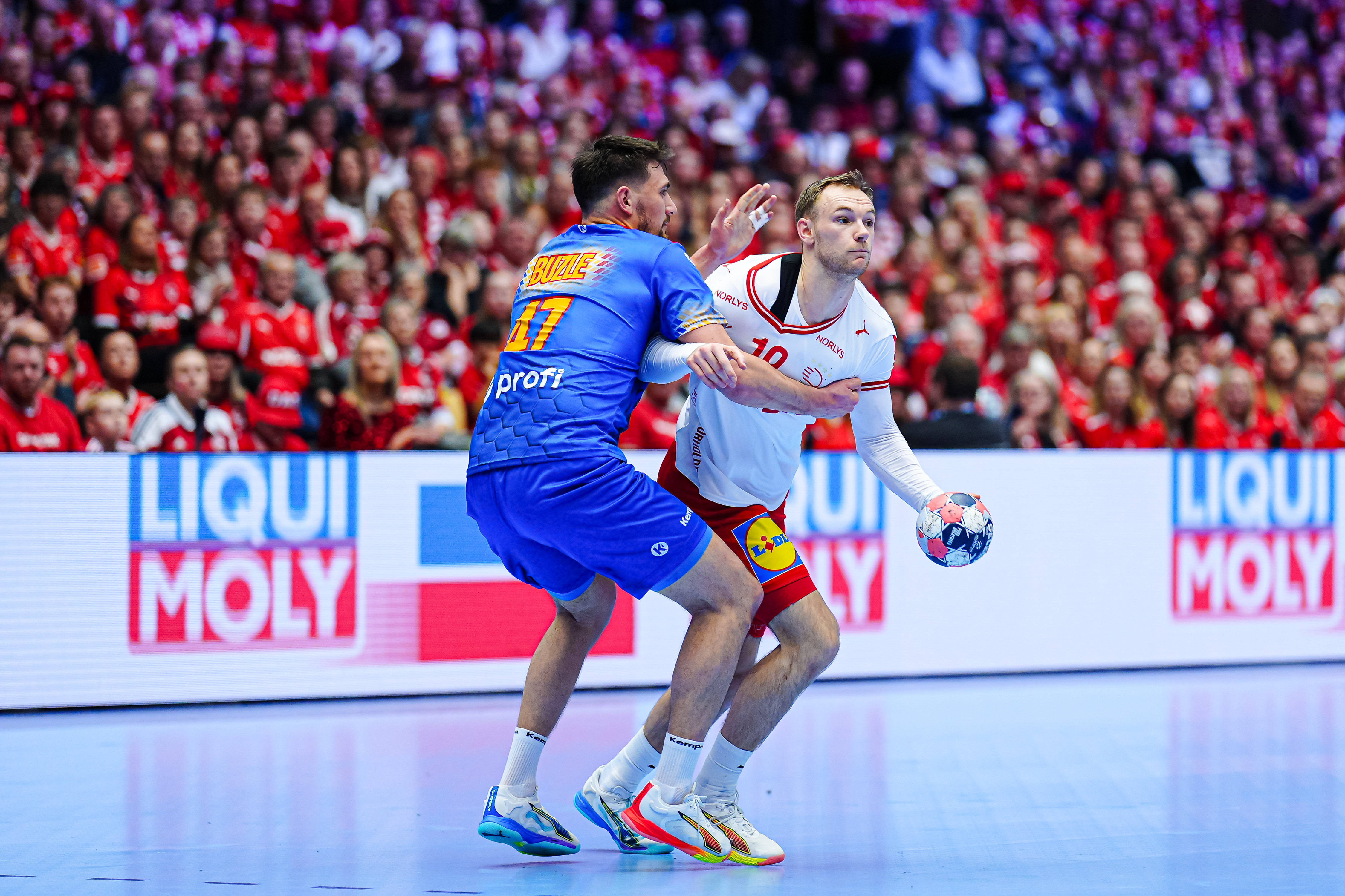România a aplicat o partitură bine pusă la punct de Buricea. Fără teamă, cu multă inspirație la linia de 9 metri și cu o defensivă care nu a lăsat culoare! A condus marea campioană Danemarca la început de meci, apoi a încercat o varietate de scheme la linia de 9 metri. Semnul că tricolorii nu sunt timorați a fost dat de golul prin aeriană marcat de Andrei Buzle - VEZI VIDEO mai jos! Și pivotul Călin Dedu, mobil și inspirat, a avut o contribuție mare în fața campioanei mondiale. E 17-22, un rezultate bun împotiva unei selecționată plină de vedete ale sportului cu mingea pe semicerc.