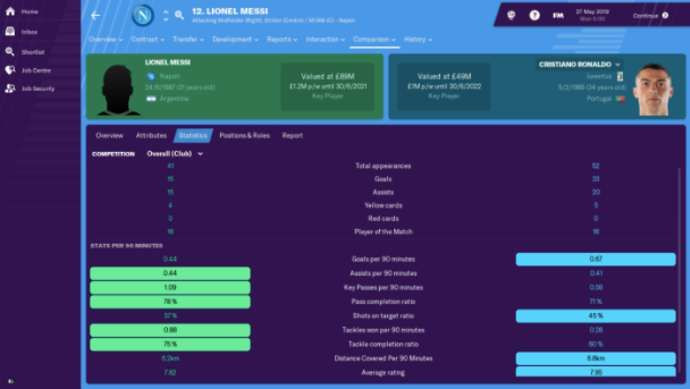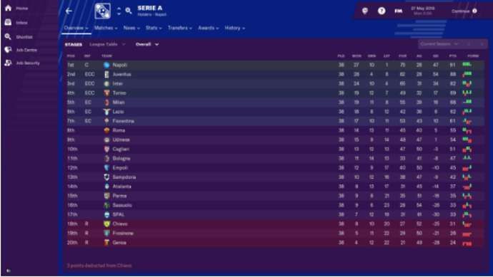 Astfel, Napoli, cu ajutorul lui Messi, reuseste sa castige titlul cu 3 puncte avans in fata lui Juventus! Pe plan individual, Ronaldo are insa sezonul mai bun cu 33 de goluri si 20 de assist-uri, in timp ce Messi are 15 goluri si 15 assist-uri. Ratingul de final este in favoarea lui Ronaldo, 7.95, fata de 7.82 al lui Messi.