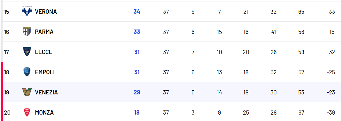 S-ar ajunge astfel la un scenariu în care Verona, Parma, Lecce și Empoli ar avea toate câte 34 de puncte. Pentru departajarea inițială se va face un clasament în patru cu meciurile directe, unde Lecce (12p) și Empoli (11p) stau cel mai bine și s-ar salva. Parma și Verona, care au strâns doar 4, respectiv 3 puncte în duelurile directe din acest "minigrup", ar fi formațiile care vor juca la barajul de menținere, scrie Parma Today.