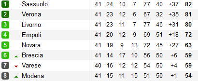 Lupta pentru promovare este extrem de stransa. Sassuolo conduce clasamentul in Serie B, cu o etapa inainte de finalul sezonului. Avantajul este insa foarte fragil. Primele trei echipe sunt despartite de doar doua puncte. Locurile 1 si 2 asigura promovarea directa, fara baraj.