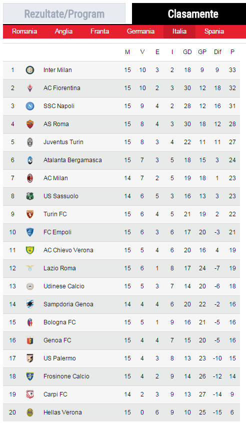 Napoli a cazut astfel de pe primul pe al treilea loc, in timp ce Fiorentina a ajuns pe pozitia a doua.