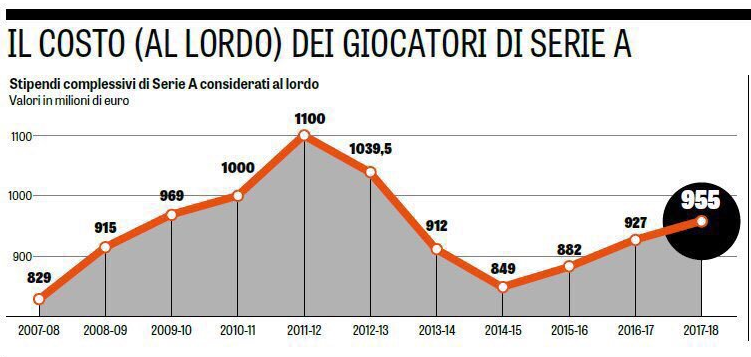 Iata mai jos cum au evoluat salariile in Serie A in ultimele sezoane. In sezonul 2011-12, suma totala a contractelor din Serie A a atins nivelul record de 1,1 miliarde de euro.