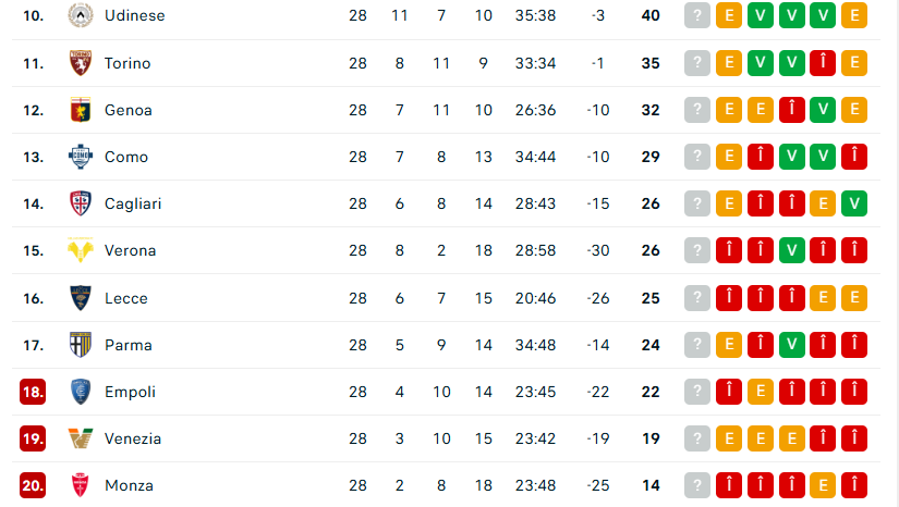 După 28 de etape disputate în campionat, Parma se află pe locul 17, deasupra liniei roșii, însă la diferență mică față de ultimele trei clasate.