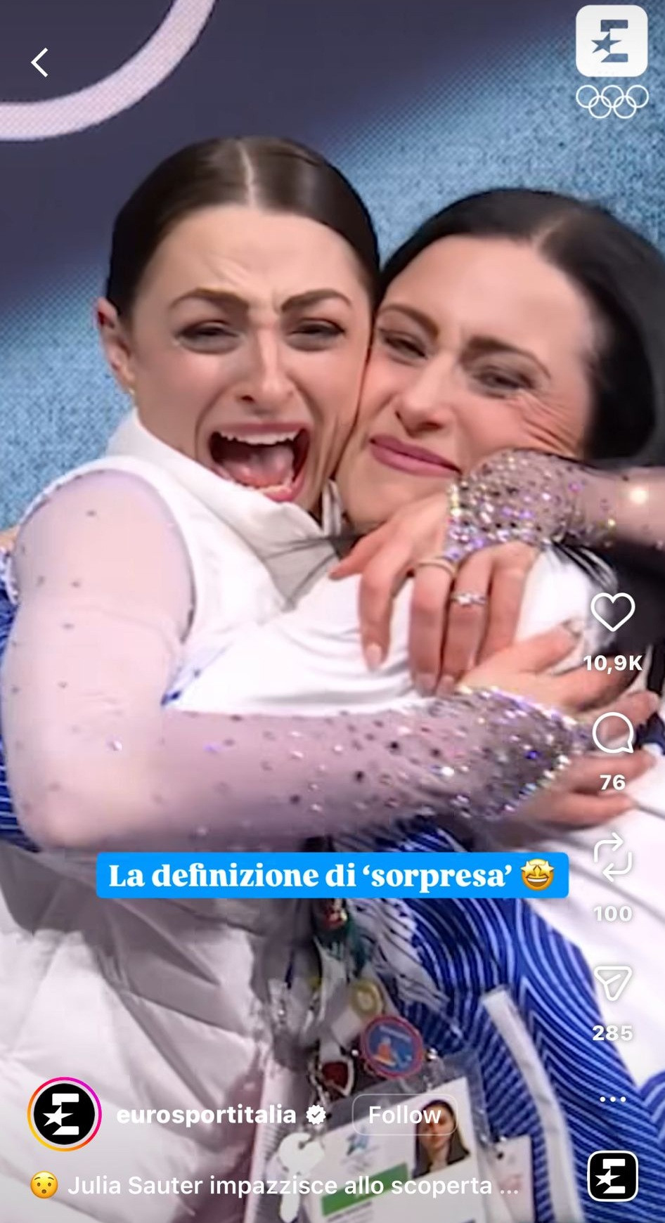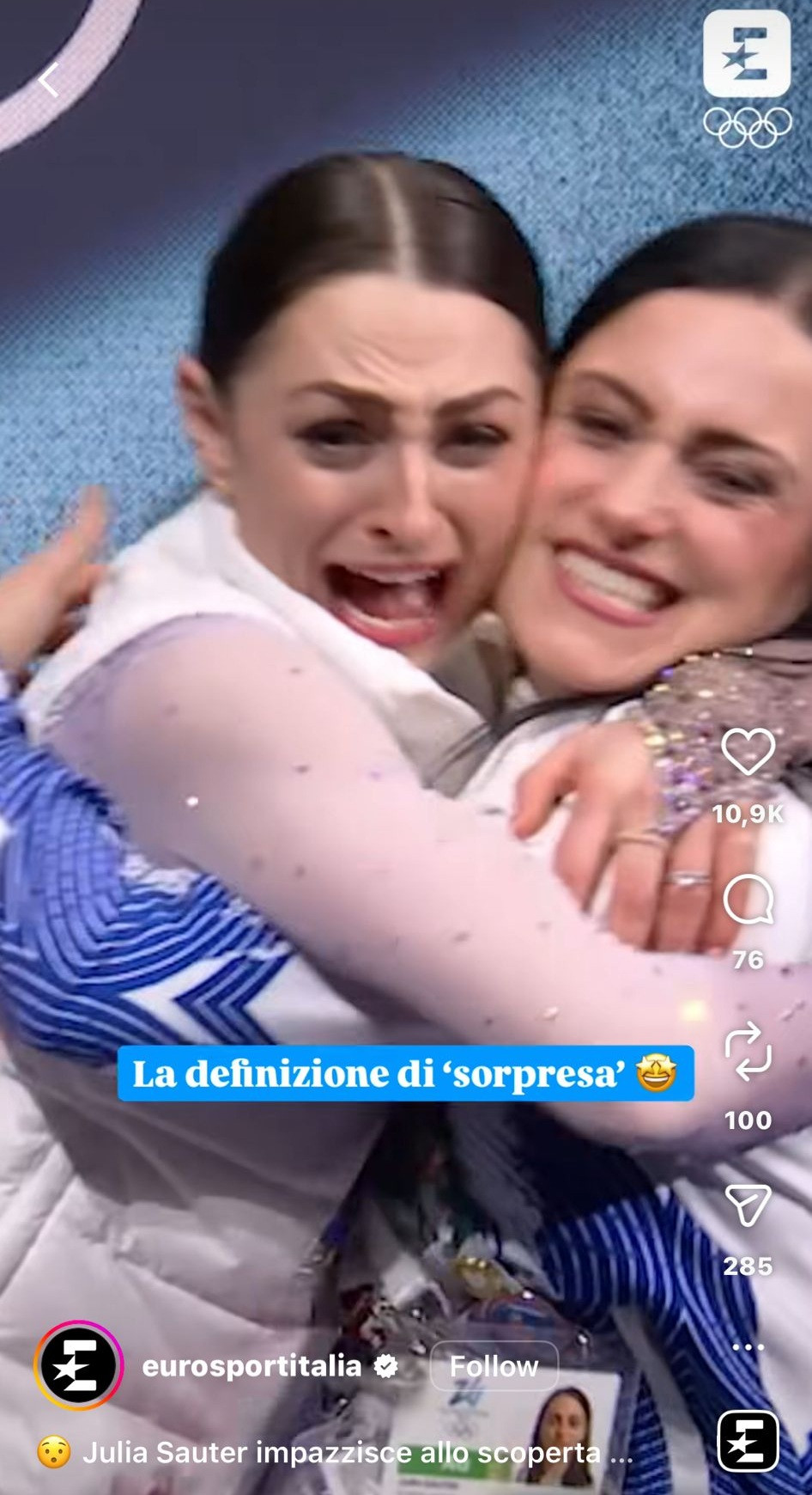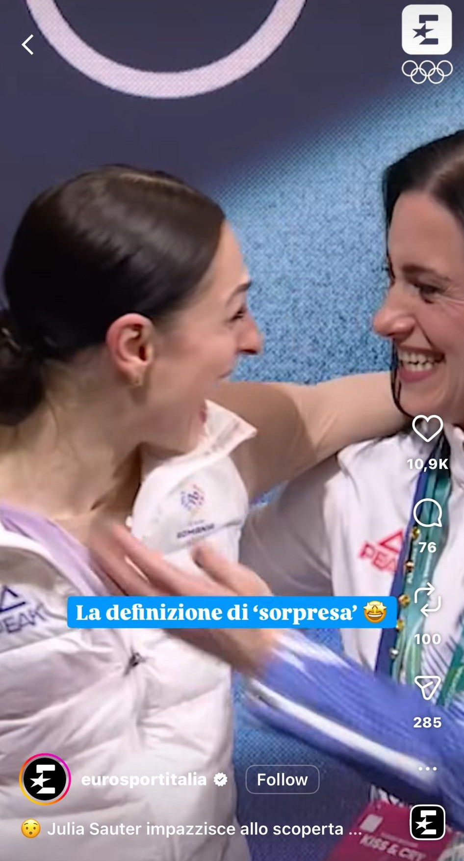 Imediat după ce a aflat că a obținut 127,80 puncte la programul liber, Julia Sauter a țipat de bucurie și și-a îmbrățișat antrenoarea, pe Roxana Luca, cea care deținea precedentul record al României la patinaj artistic (locul 23 în 2002).