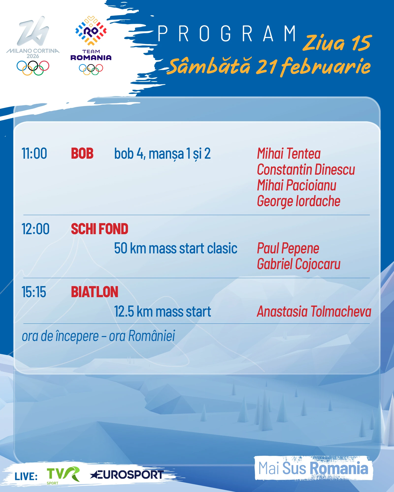 De la ora 15.15 începe proba de biatlon, unde România va fi reprezentată la 12.5 km mass start de Anastasia Tolmacheva, scrie news.ro.