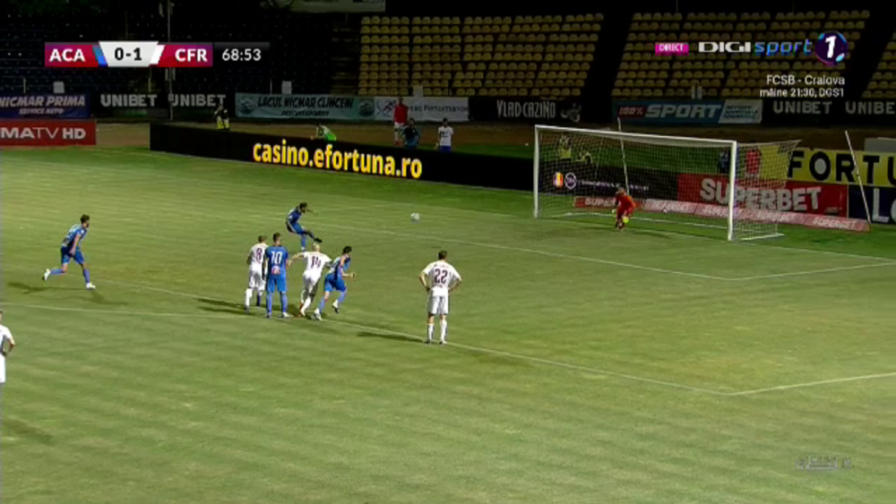 Min. 61: GOOOOOL CFR! Păun pătrunde în careu și centrează, Debeljuh a lăsat balonul să treacă, iar Petrila a șutat direct, învingându-l pe portar!