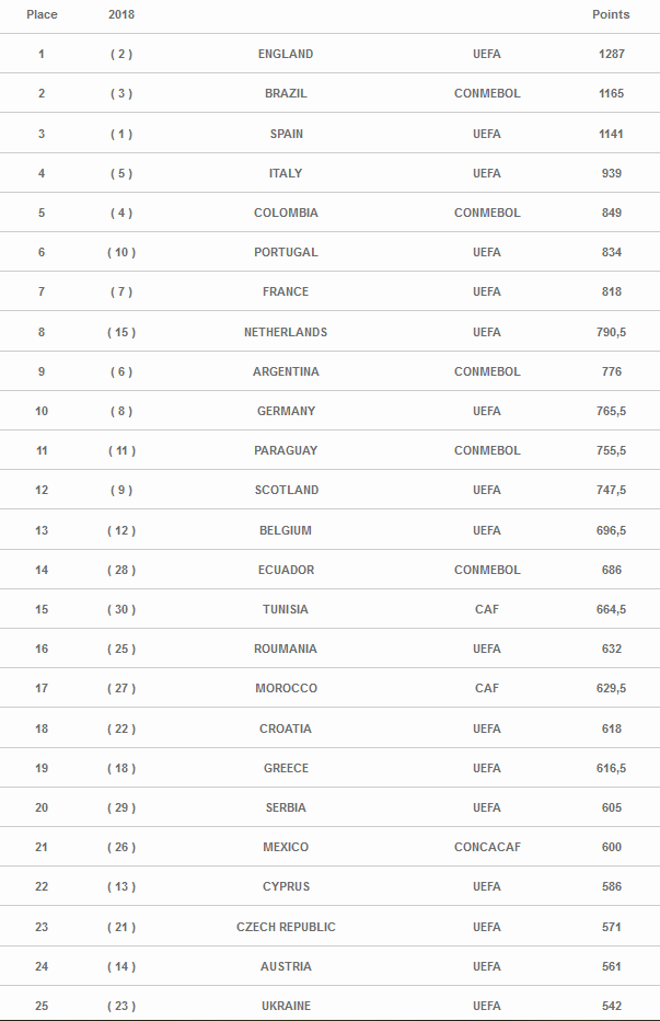 Pe primele pozitii sunt Anglia (1287 puncte), Brazilia (1165 puncte) si Spania (1141 puncte).
