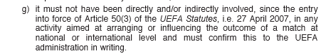 Articolul 2.04.g) "Un club nu trebuie sa fie implicat direct si/sau indirect, in nicio activitate de incercare de a aranja sau de a influenta rezultatul unui meci la nivel intern sau international si trebuie sa fie confirmat catre administratia UEFA in scris."