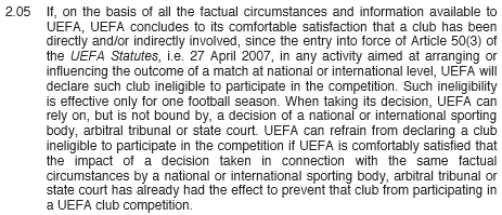 Articolul 2.05 "Daca, pe baza tuturor faptelor si informatiilor avute la dispozitie, UEFA ajunge la concluzia ca un club a fost direct si/sau indirect implicat, de la intrarea in vigoare a articolului 50 (3) din Statutul UEFA, 27 aprilie 2007, in orice activitate cu privire la aranjarea sau influentarea rezultatului unui meci la nivel national sau international, UEFA va declara un asemenea club neeligibil pentru a participa in competitie. Aceasta neeligibilitate este efectiva pentru doar un sezon. In luarea deciziei, UEFA se poate baza, dar nu obligatoriu, pe decizia unui for sportiv national sau international, tribunal arbitral sau instanta de stat. UEFA se poate abtine in a declara un club neeligibil de a participa intr-o competitie, daca UEFA este multumita de impactul deciziei luate in legatura cu anumite circumstante faptice de un for sportiv national sau international, tribunal arbitral sau instanta de stat, care are ca efect impiedicarea clubului sa participe intr-o competitie UEFA."
