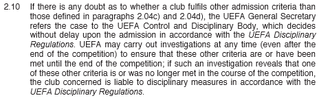 Articolul 2.10 Daca exista vreun dubiu ca un club indeplineste alte criterii de admitere decat cele definite in paragrafele 2.04c) (n.r. - trebuie sa fi obtinut o licenta eliberata de forul national competent in concordanta cu Licentierea cluburilor si a fair-play-ului financiar si sa fie inclusa pe lista inaintata de federatie la UEFA) si 2.04 d) (n.r. - trebuie sa se supuna regulilor menite sa asigure integritatea competitiei asa cum este ea definita la articolul 3), secretarul general al UEFA va trimite cazul la Comisia de Disciplina si Control a UEFA, care va decide fara intarziere in privinta admiterii in concordanta cu Regulamentul Disciplinar al UEFA. UEFA va putea deschide investigatii oricand (chiar si dupa finalul competitiei) pentru a se asigura ca acele conditii sunt sau au fost intrunite pana la finalul competitiei; daca o astfel de investigatie releva ca unele dintre celelalte criterii sunt sau nu au fost indeplinite in timpul competitiei, clubul poate fi supus masurilor disciplinare in concordanta cu Regulamentul Disciplinar al UEFA."