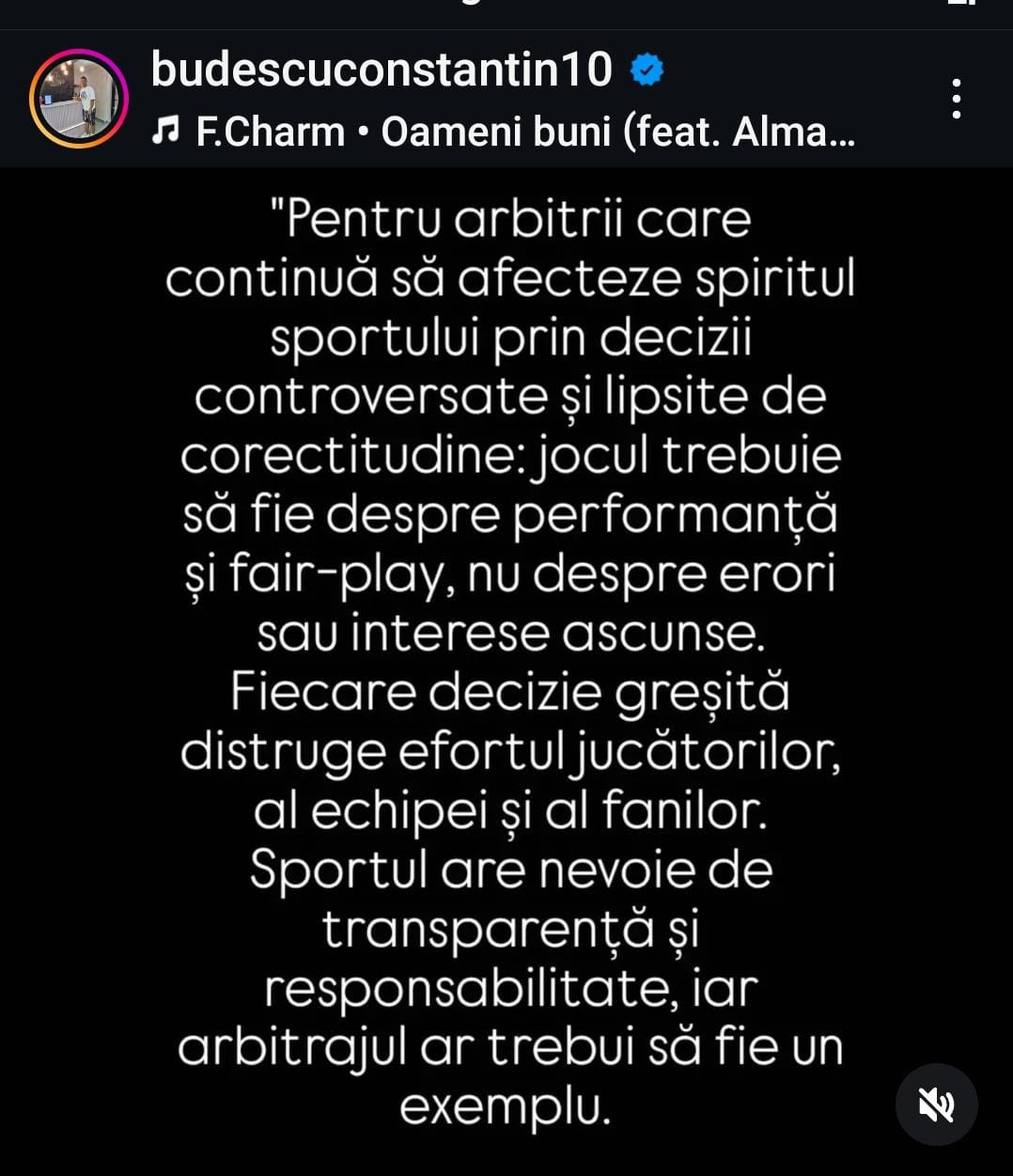 Sportul are nevoie de transparență și responsabilitate, iar arbitrajul ar trebui să fie un exemplu”, a scris Constantin Budescu pe pagina sa oficială de Instagram.